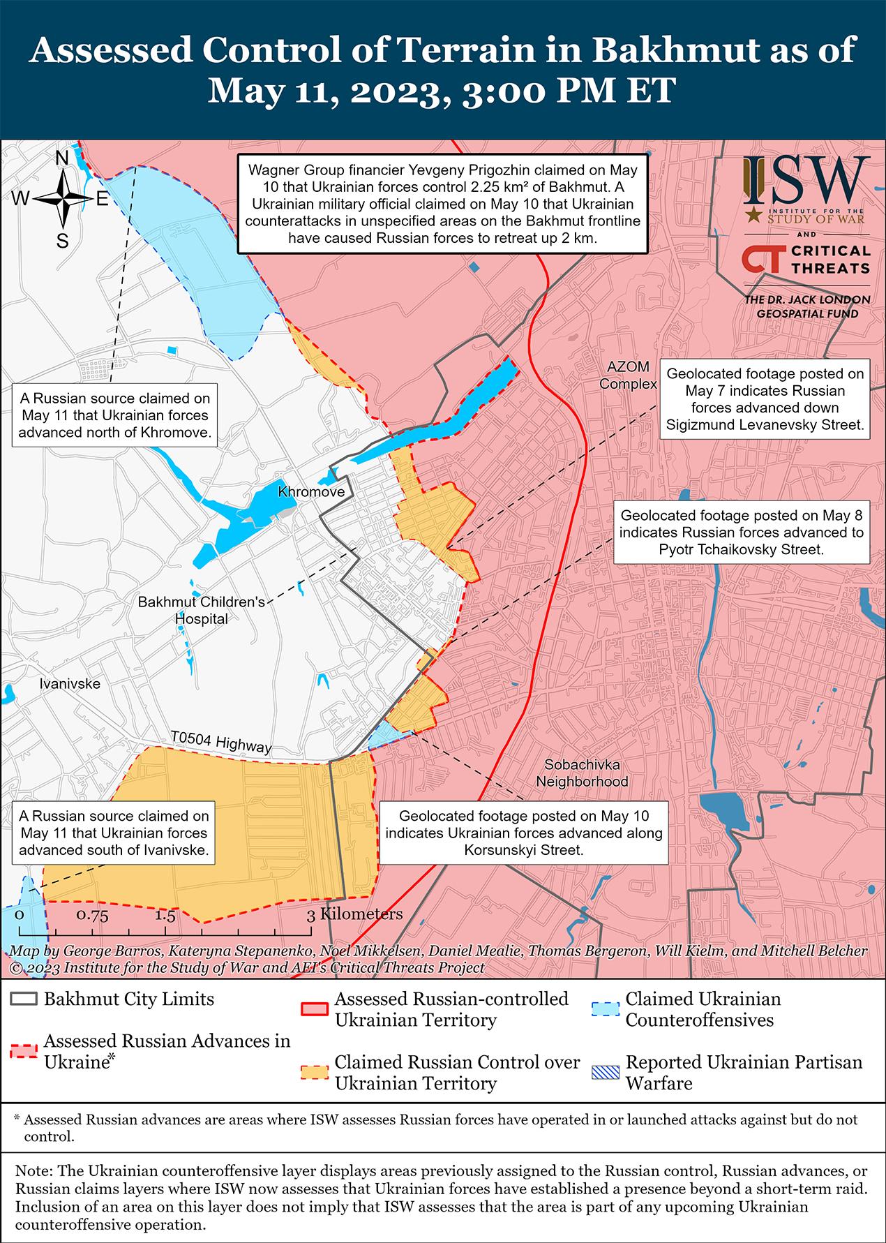 11 мая украинские силы продолжали проводить локальные контратаки в районе Бахмута. На геолокационных кадрах видно, что украинские силы вытеснили российские войска с участка трассы Т0504 Бахмут-Часов Яр на юго-западе Бахмута. Российские блогеры утверждали, что украинские войска продвинулись к северо-западу от Бахмута в районе Богдановки (6 км к северо-западу от Бахмута) и Хромова (непосредственно к западу от Бахмута) после того, как российские войска отступили с позиций к северу от Хромова. Российские блогеры также утверждали, что украинские силы атаковали в Бахмуте, чтобы смягчить давление на трассу Бахмут-Часов Яр. Российский блогер утверждал, что украинские силы отвоевали позиции к югу и юго-западу от Ивановского (6 км к западу от Бахмута) и к западу от Клещеевки (6 км к юго-западу от Бахмута).