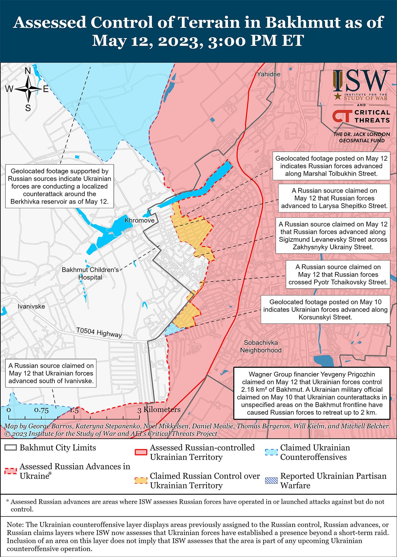 По состоянию на 12 мая украинские силы добились успехов к северо-западу от Бахмута в локальных контратаках. На геолокационных кадрах, опубликованных 12 мая, видно, как российские войска спасаются от огня украинской артиллерии на южном берегу Берховского водохранилища, примерно в 4 км к северо-западу от Бахмута. Эти кадры наглядно подтверждают утверждения ряда российских блогеров о том, что украинские силы добились успехов к северо-западу от Бахмута в районе между Богдановкой и Берховкой. Один российский блогер заявил, что подразделения 200-й отдельной мотострелковой бригады (14-й армейский корпус, Северный флот) потеряли позиции в районе между Григоровкой и Дубово-Васильевкой (примерно в 6 км к северо-западу от Бахмута). Несколько российских источников предупредили, что украинские силы, возможно, пытаются окружить группу Вагнера в Бахмуте. Финансист группы Вагнера Евгений Приогожин подчеркнул, что украинские войска приближаются к Берховке, и заявил, что Украина сейчас занимает позиции в пределах 500 м от северо-западной черты города Бахмут. Российские блогеры также сообщили, что украинские войска контратакуют в направлении Хромова (3 км к западу от Бахмута), Богдановки (6 км к северо-западу от Бахмута) и Клещеевки (6 км к юго-западу от Бахмута). Один российский блогер заявил, что ситуация к юго-западу от Бахмута под Майорском стабилизировалась после украинских ударов по позициям 1-го армейского корпуса Донецкой Народной Республики. Министерство обороны России (МО) отвергло утверждения других российских источников об украинских успехах и вместо этого заявило, что подразделения 4-й отдельной мотострелковой бригады (Луганская Народная Республика) и 200-й отдельной мотострелковой бригады (14-й армейский корпус, Северный флот) отразили все атаки в районе Берховки «с учетом благоприятных условий Берховского водохранилища».