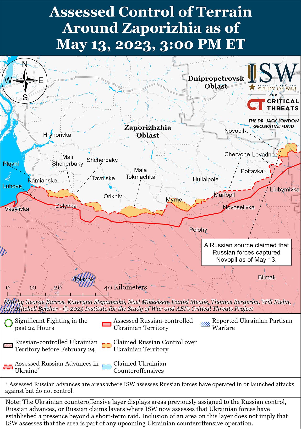Украинские силы продолжают контрнаступление в районе Бахмута на фоне неподтвержденных заявлений о дальнейших незначительных успехах Украины к юго-западу от города по состоянию на 13 мая. Российский милблогер заявил, что украинские силы установили новые позиции на окраине Курдюмовки (14 км к юго-западу от Бахмута) и оттеснили российские войска за канал Северский Донец-Донбасс в этом районе. Блогер также сообщил, что украинские силы продвинулись в направлении Клещеевка (7 км к юго-западу от Бахмута) со стороны Предтечино (16 км к юго-западу от Бахмута). По состоянию на 13 мая ISW не наблюдал визуального подтверждения этих дополнительных украинских успехов к юго-западу от Бахмута или где-либо еще в районе Бахмута. Командующий Восточной группировкой войск Украины генерал-полковник Александр Сырский 13 мая заявил, что украинские силы продвигаются на неуточненных участках фронта, а украинский Генштаб сообщил, что украинские силы в настоящее время ведут активные действия в районе Бахмута. 13 мая спикер Восточной группировки войск Украины полковник Сергей Череватый заявил, что за три дня контратак украинские силы освободили 17,3 кв. км территории на Бахмутском направлении. По оценкам ISW, по состоянию на 13 мая украинские силы освободили 16,85 кв. км в районе Бахмута в ходе недавних контратак. Российские источники распространили кадры, якобы показывающие последствия недавней украинской контратаки на российские позиции под Майорском (20 км к юго-западу от Бахмута), и утверждали, что 3-я бригада 1-го армейского корпуса Донецкой Народной Республики (ДНР) отразила атаки. Известный российский блогер заявил, что недавние успешные ограниченные украинские контратаки к северу от Хромова (непосредственно к западу от Бахмута) ослабили способность российских войск перекрыть трассу О0506 между Хромовом и Часовым Яром (13 км к западу от Бахмута), важную наземную линию коммуникаций (НЛК) для украинских сил, действующих в самом Бахмуте. Милблогер утверждал, что отступления России в ответ на недавние украинские контратаки происходили на относительно небольших участках линии фронта, но предупредил, что эти «перегруппировки» могут стать более значительными, если российские войска не смогут стабилизировать линию фронта. Финансист группы Вагнера Евгений Пригожин заявил 12 мая, что разговоры о тактическом выводе российских войск являются нонсенсом, поскольку российские войска продолжают прямо оставлять позиции в неуказанных местах.