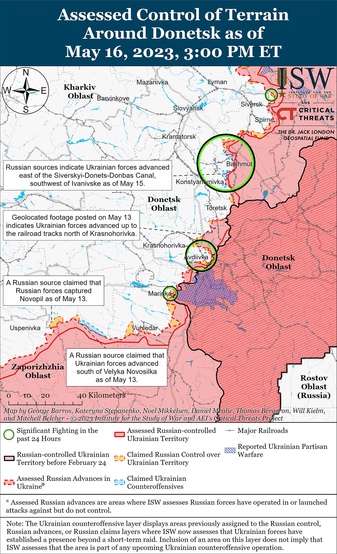 Украинские военные чиновники продолжают сообщать, что Украина проводит гораздо более ограниченные операции в районе Бахмута, чем российские войска, которые, похоже, привержены Бахмуту как возобновленным основным усилиям. 16 мая Маляр заявила, что, хотя за последние дни украинские силы освободили около 20 квадратных километров территории, российские войска продолжают добиваться незначительных успехов в Бахмуте. Командующий Восточной группировкой войск Украины генерал-полковник Александр Сырский заявил, что украинские силы продолжают использовать концепцию «активной обороны» при проведении контратак в неустановленных районах вблизи Бахмута. Спикер Восточной группировки войск Украины полковник Сергей Череватый напомнил, что основной целью украинской оборонительной операции в районе Бахмута является истощение российских сил в этом районе. ISW геолоцировал опубликованные 16 мая кадры украинских позиций на юго-западе Бахмута, которые свидетельствуют о том, что украинские силы в последнее время добились ограниченных успехов в самом городе. На геолокационных кадрах, опубликованных 16 мая, видно, что украинские силы добились незначительных успехов к востоку от Орехово-Васильевка (11 км к северо-западу от Бахмута), хотя по состоянию на 16 мая ISW не зафиксировал каких-либо дальнейших успехов Украины в районе Бахмута.