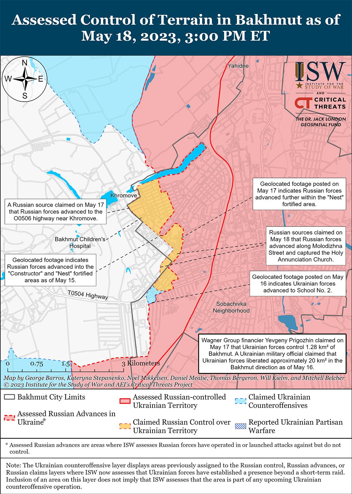 Украинские силы захватили тактическую инициативу и добились тактических успехов в районе Бахмута в ходе контрнаступательных операций 18 мая. Эти операции являются продолжением локальных контратак, которые украинские силы проводят в течение нескольких дней, и не отражают начало новой крупной операции. Несколько российских блогеров утверждали, что украинские силы прорвались через российские оборонительные рубежи к югу и юго-западу от Ивановского (6 км к западу от Бахмута) и к северо-западу от Клещеевки (6 км к юго-западу от Бахмута) с северо-запада. Военные блогеры также утверждали, что российские войска отступили с позиций к северу от Сакко-и-Ванцетти (15 км к северу от Бахмута) на позиции к югу от населенного пункта, но украинские силы еще не вошли в населенный пункт. Финансист группы Вагнер Евгений Пригожин заявил, что российские войска уступили 570 метров территории к северу от Бахмута, что согласуется с заявлением заместителя министра обороны Украины Анны Маляр о том, что украинские силы продвинулись на 500 метров к северу от Бахмута и на 1 000 метров к югу от Бахмута. Пресс-секретарь Восточных сил Украины полковник Сергей Череватый заявил, что за последние сутки украинские силы продвинулись на 1 700 метров, а украинская 3-я отдельная штурмовая бригада заявила, что контратаки бригады расширили украинский выступ в районе Бахмута до 2 000 метров в ширину и 700 метров в глубину.