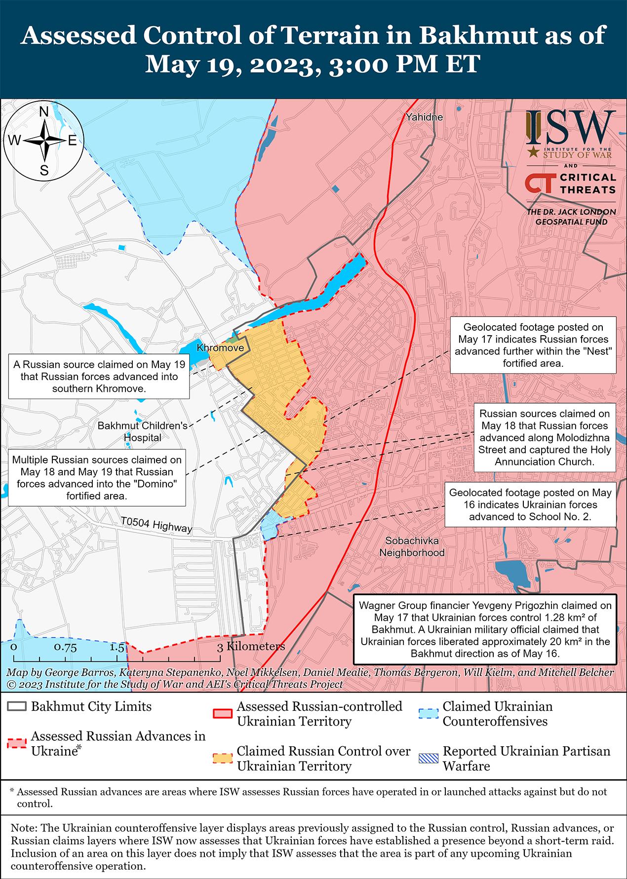 19 мая российские войска продолжали наносить наземные удары в районе Бахмута. Российские военные блогеры по-разному утверждали, что силы группы Вагнера либо продвинулись вглубь, либо полностью очистили украинский укрепрайон в западном Бахмуте 18 и 19 мая. Однако геолокационные кадры свидетельствуют о том, что по состоянию на 18 мая украинские силы удерживают позиции в укрепрайоне. 19 мая военный блогер заявил, что «Вагнер» также продвинулся к въезду в Бахмут по трассе Т0504 Бахмут – Часов Яр в юго-западной части города. Генштаб Украины сообщил о продолжении боевых действий в Бахмуте и о безуспешных наступательных действиях в направлении Ивановского (6 км к западу от Бахмута) и Белой Горы (14 км к юго-западу от Бахмута). Различные голоса в российском информационном пространстве преждевременно заявляют, что силы Вагнера завершили захват Бахмута 19 мая, вызывая гнев других доминирующих голосов. ISW не обнаружил никаких признаков того, что украинские силы проводят контролируемый отвод со своих оставшихся позиций в городе или что атаки ЧВК Вагнер в ближайшее время угрожают захватом всех оставшихся украинских позиций.