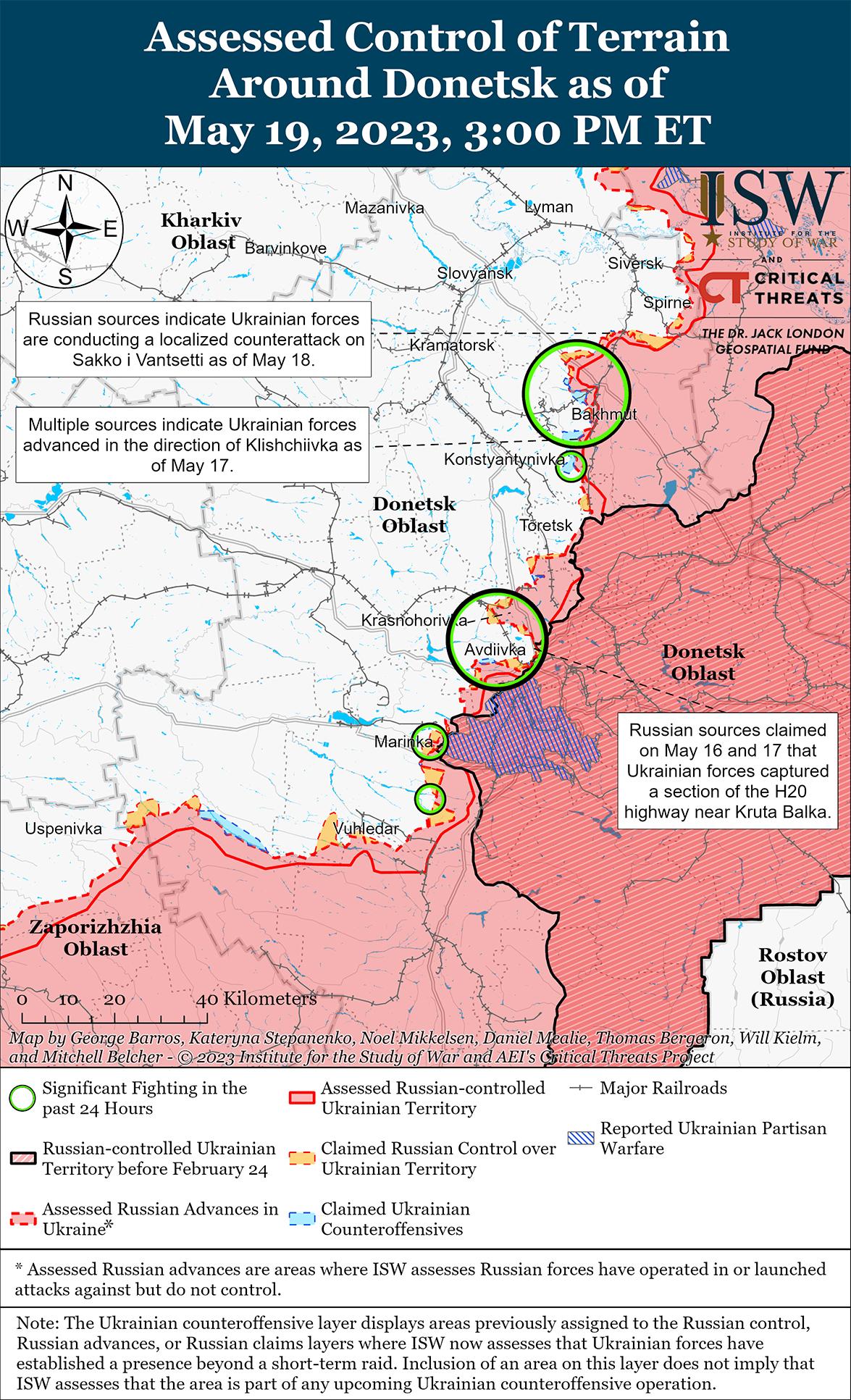 Украинский чиновник заявил, что российские войска сосредоточили большую часть имеющихся резервов в районе Бахмута и замедлили украинские контратаки за последние 24 часа. Заместитель министра обороны Украины Анна Маляр 19 мая заявила, что российские войска сосредоточили большую часть своих резервов на Бахмутском направлении, что замедлило темпы украинского продвижения. Маляр также заявила, что украинские силы продолжают контратаковать на северных и южных окраинах Бахмута и продвинулись на 500 метров с одного фланга и на 1 000 метров с другого. Некоторые российские блогеры отмечали замедление темпов продвижения украинских войск и утверждали, что украинские силы не в состоянии выдержать длительные локальные контратаки вокруг Бахмута. Однако российские силы на флангах Бахмута, вероятно, остаются слабыми; Финансист группы Вагнер Евгений Пригожин 19 мая продолжил критиковать российскую 4-ю мотострелковую бригаду (2-й армейский корпус Луганской Народной Республики) за отступление с оборонительных рубежей к юго-западу от Ивановского (6 км к западу от Бахмута). Украинские контратаки под Бахмутом, скорее всего, устранили угрозу окружения Россией украинских сил в Бахмуте и вынудили российские войска выделить скудные военные ресурсы для защиты от ограниченных и локализованных наступательных действий, как, вероятно, и предполагало украинское командование.