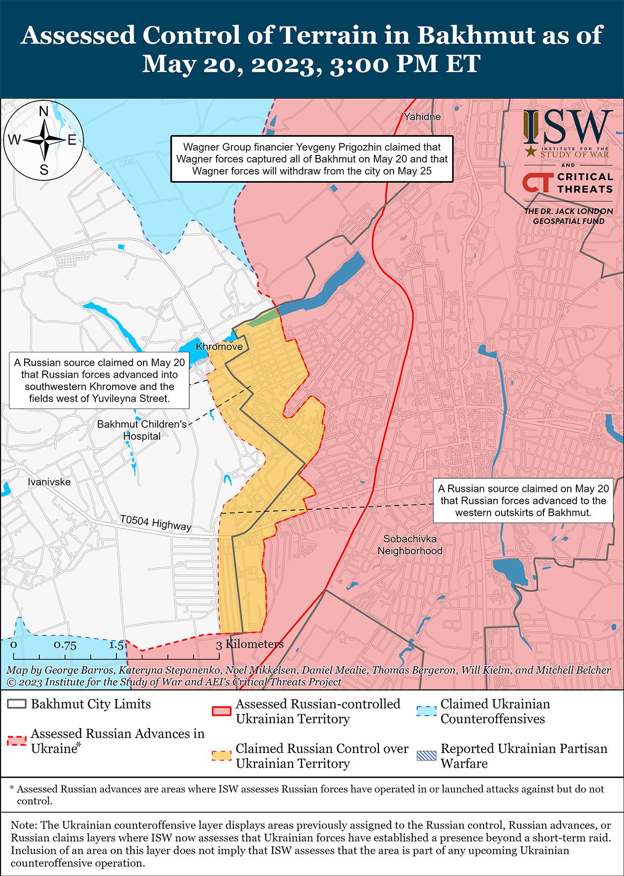 Заявленная Пригожиным победа над оставшимися районами в Бахмуте является чисто символической, хотя и правдой. Последние несколько городских кварталов восточного Бахмута, которые, по утверждению Пригожина, захватили силы группы Вагнера, не имеют ни тактического, ни оперативного значения. Их захват не дает российским войскам оперативно значимой местности для продолжения ведения наступательных операций или какой-либо особо сильной позиции, с которой можно было бы защищаться от возможных украинских контратак.
