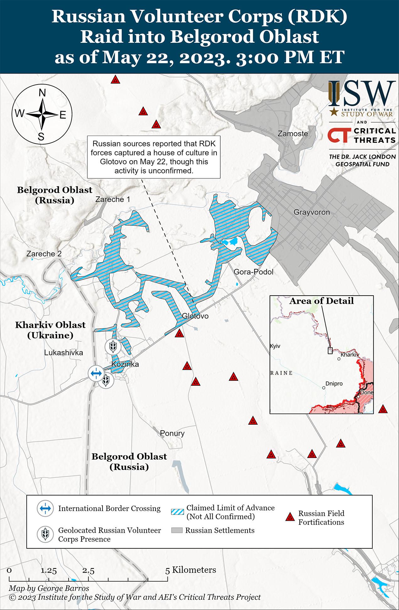22 мая подразделения общероссийского проукраинского Русского добровольческого корпуса (РДК) и легиона «Свобода России» (ЛСР) провели рейд в Белгородскую область. Российские источники начали сообщать утром 22 мая, что отряд РДК и ЛСР в составе двух танков, бронетранспортера и девяти других бронемашин пересек международную границу и захватил населенный пункт Козинка в Грайворонском районе Белгородской области в пределах 600 метров от границы с Сумской областью. Несколько российских источников утверждали, что затем группировка захватила населенные пункты Глотово и Гора Подол (3 км и 5 км от границы соответственно), хотя некоторые военные блогеры оспаривали утверждения о том, что в результате атаки были полностью захвачены Глотово или Гора Подол, вместо этого сообщая, что силы РДК добрались только до Глотовского Дома культуры. ISW пока не наблюдал геолокационного подтверждения того, что РДК или ЛСР достигли Глотово или Горы-Подола. Геолокационные кадры, опубликованные 22 мая, подтверждают, что РДК нанес удар по пограничному посту возле Козинки, прежде чем пересечь границу по крайней мере на одном танке. РДК также опубликовала кадры, на которых, как сообщается, видно тело российского пограничника на пограничной станции, вероятно, с пограничного перехода возле Козинки. Позже российские блогеры утверждали, что российские войска вернули контроль над всеми тремя населенными пунктами. Некоторые российские источники также сообщали, что российские войска отразили атаки проукраинских диверсионных групп возле Дроновки, примерно в 22 км к северо-западу от Козинки. Кроме того, РДК опубликовала кадры, которые, как сообщается, находятся за пределами двух населенных пунктов вблизи приграничной зоны в Брянской области, но характер этого вторжения неясен, и ISW не обнаружил дополнительных доказательств или обсуждений действий в Брянской области 22 мая.