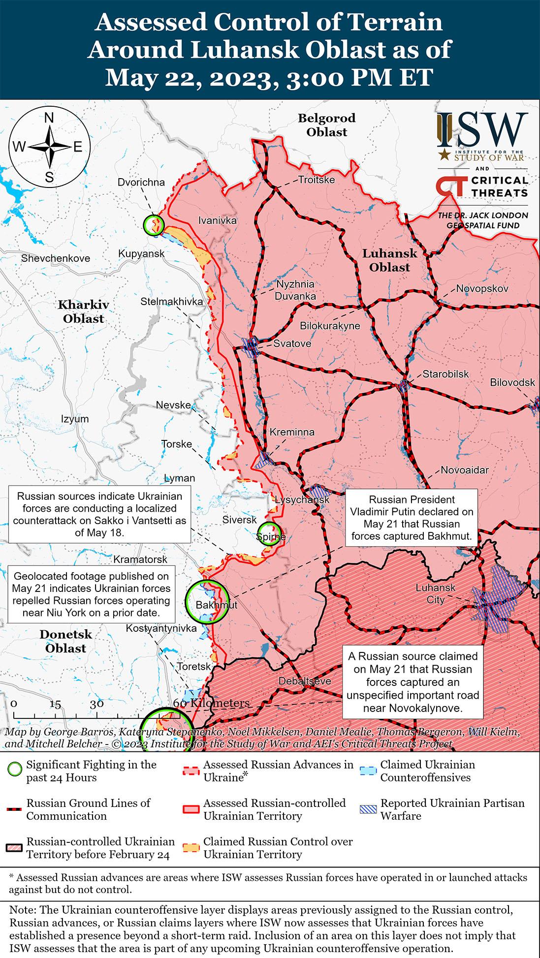 Украинские официальные лица заявили, что 22 мая в Бахмуте и его окрестностях продолжались ограниченные бои. В украинском Генштабе сообщили, что в Бахмуте продолжаются бои и что российские войска провели безуспешные наземные атаки вблизи Григоровки (8 км к северо-западу от Бахмута) и к югу от Ивановского (непосредственно к западу от Бахмута). Заместитель министра обороны Украины Анна Маляр подтвердила, что украинские силы удерживают позиции в укрепрайоне на западе Бахмута и что бои за высоты к северу и югу от Бахмута продолжаются. На геолокационных кадрах, опубликованных 21 мая, видно, что ЧВК «Вагнер» продвигается к трассе Т0504 к юго-западу Бахмута. Известный российский блогер заявил, что по состоянию на 21 мая к западу от Бахмута под Хромовым продолжаются бои. 22 мая другой блогер заявил, что российские войска предприняли ограниченную наземную атаку к югу от Бахмута в районе Белой Горы. Глава Донецкой Народной Республики (ДНР) Денис Пушилин, финансист группы Вагнера Евгений Пригожин и другие российские источники утверждали, что российские войска начали операции по зачистке и разминированию на западной окраине Бахмута.