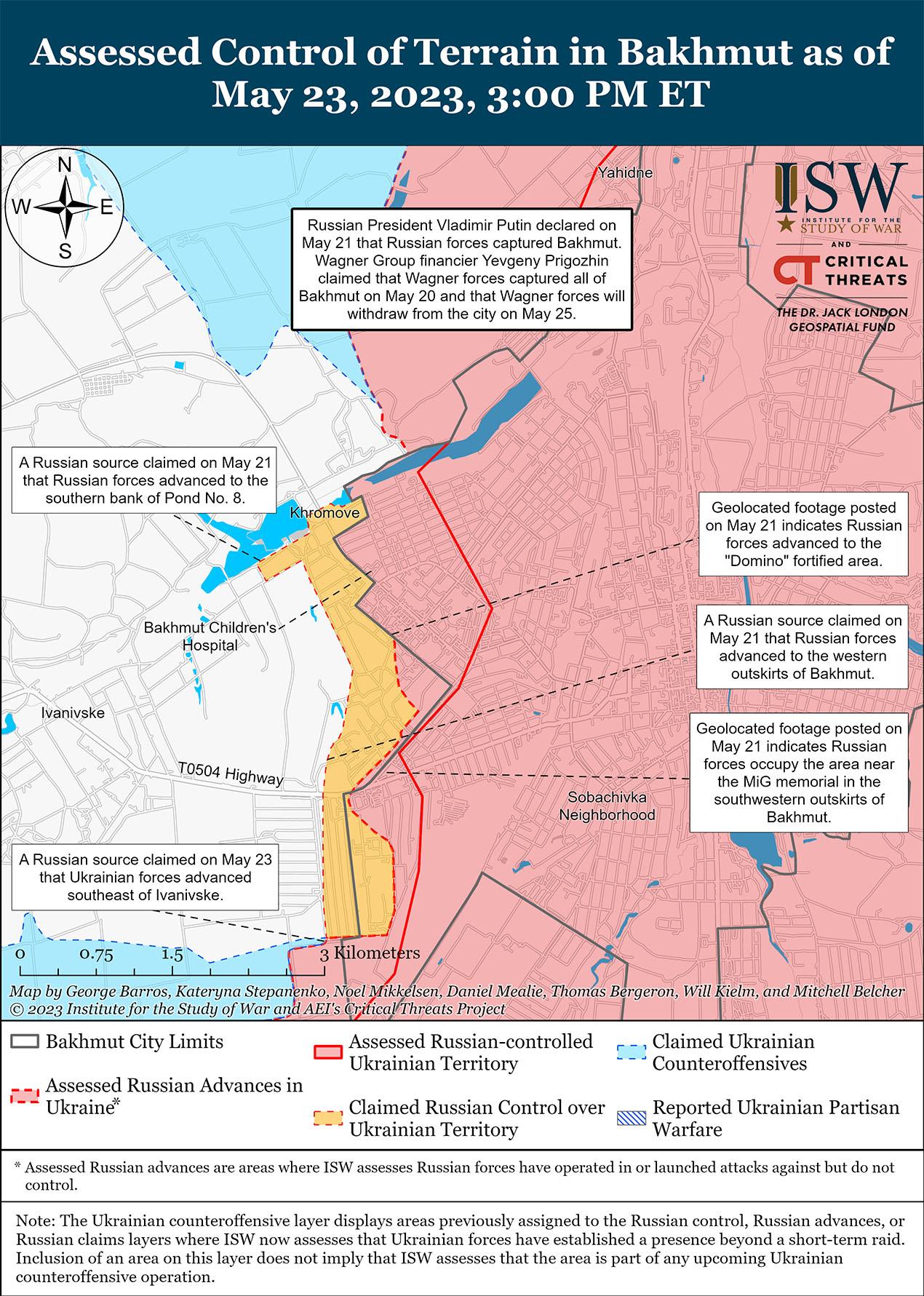 Украинские официальные лица заявили, что темпы боев на бахмутском направлении снизились на фоне продолжающихся ограниченных украинских контратак на флангах Бахмута 23 мая. Генштаб Украины не сообщил о боях в городе Бахмут в своем оперативном отчете на 18:00 впервые с декабря 2022 года. предполагая, что силы группы Вагнера могли продвинуться дальше в пределах города. Генштаб также сообщил, что российские войска вели безуспешные наступательные действия в районе Хромово (непосредственно к западу от Бахмута). Заместитель министра обороны Украины Анна Маляр заявила, что боевые действия в Бахмуте и его окрестностях уменьшились, и подтвердила, что украинские силы сохраняют позиции в укрепленном районе возле памятника МиГ-17 в западной части Бахмута. Один из милблогеров распространил видеозапись, якобы показывающую силы Вагнера возле памятника МиГ-17, и заявил, однако, что украинских сил в этом районе нет. Пресс-секретарь Восточной группы войск Украины полковник Сергей Череватый заявил, что украинские войска продвинулись на 200-400 метров по флангам Бахмута и по-прежнему контролируют ряд зданий и укреплений на юго-западе Бахмута. Российский милблогер утверждал, что украинские войска продвинулись в районе Ягодного (1 км к северо-западу от Бахмута) и что российские войска безуспешно атаковали вблизи Григоровки (8 км к северо-западу от Бахмута) и Ивановского (непосредственно к западу от Бахмута). Другой милблогер опроверг сообщения о том, что украинские силы добились успехов в ходе контратак к северо-западу и юго-западу от Бахмута, и оценил, что российское наступление из Бахмута в сторону Ивановского или Богдановки остается маловероятным