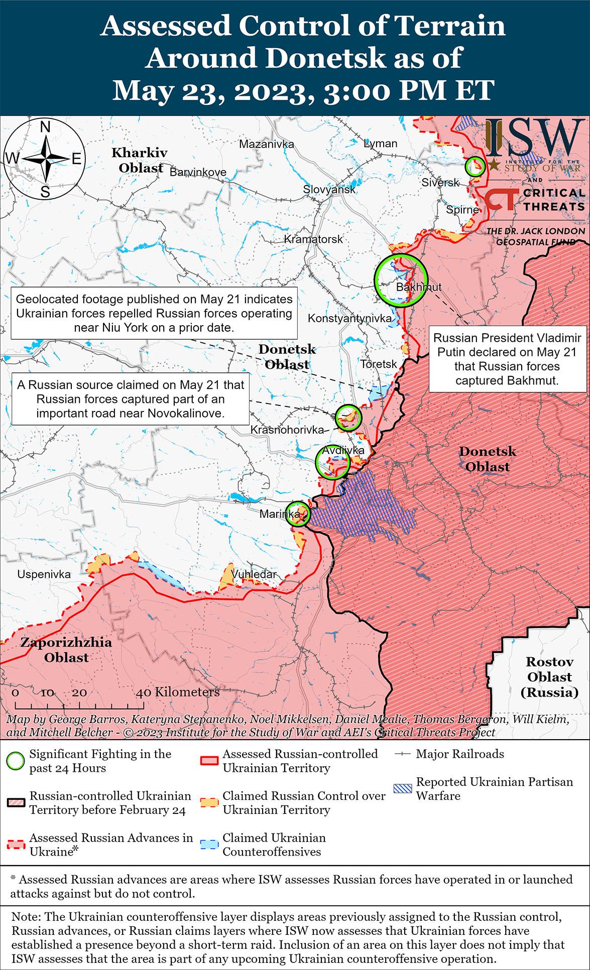 - Украинские официальные лица заявили, что темпы боев на Бахмутском направлении снизились на фоне продолжающихся ограниченных украинских контратак на флангах Бахмута 23 мая.