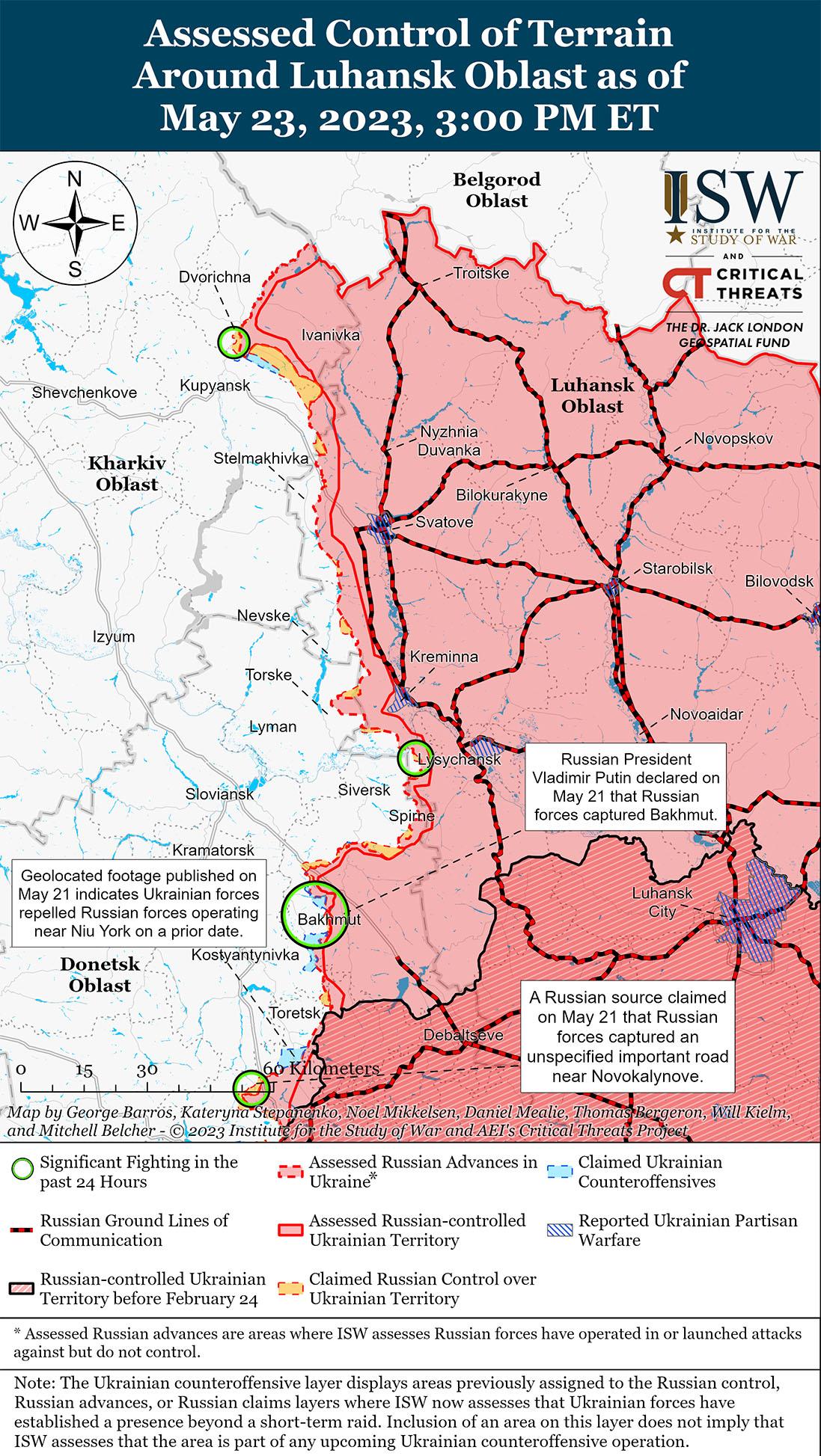 23 мая российские войска провели ограниченные наземные атаки к северо-востоку от Купянска и вдоль линии Сватово-Кременная. В Генштабе Украины сообщили, что российские войска вели безуспешные наступательные действия вблизи Масютовки (13 км к северо-востоку от Купянска) и Белогоровки (10 км к югу от Кременной). Российский блогер заявил, что российские войска заняли новые позиции возле с. Невское (18 км к северо-западу от Кременной), хотя ISW не видел визуального подтверждения этого утверждения. На видеозаписи, опубликованной 23 мая, якобы запечатлены неуказанные подразделения ВДВ, действующие в лесах под Кременной.