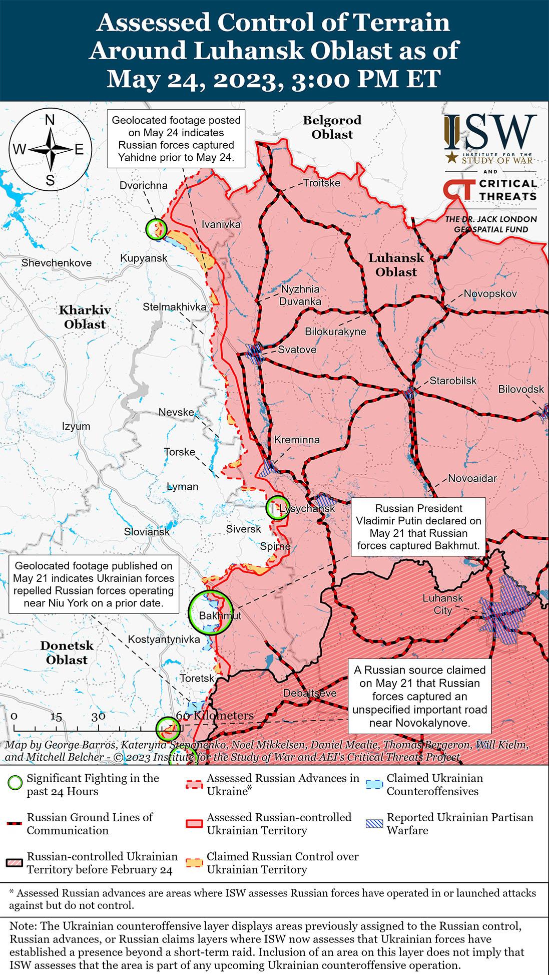 24 мая российские войска продолжили ограниченные наземные атаки на окраинах Бахмута. В Генштабе Украины сообщили, что российские войска провели безуспешные наступательные действия в направлении Ивановского (3 км к юго-западу от Бахмута) и Хромова (3 км к западу от Бахмута). Командующий Восточной группировкой войск Украины генерал-полковник Александр Сырский отметил, что украинские войска продолжают оборонительные действия на подступах к Бахмуту. Российский блогер заявил, что силы ЧВК Вагнер полностью контролируют Бахмут и что силы Донецкой Народной Республики (ДНР) медленно входят в город, чтобы взять на себя операции по зачистке. Другой российский блогер предупредил, что украинские войска могут активизировать передвижение военной техники и личного состава через Константиновку (17 км к юго-западу от Бахмута).
