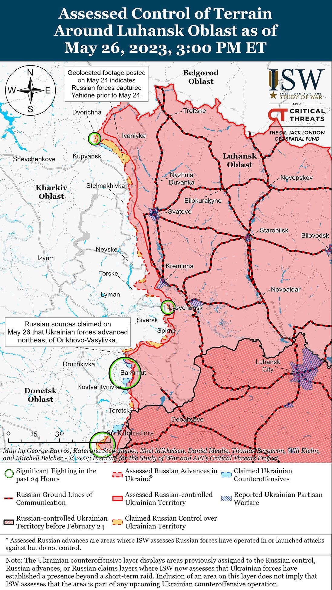 26 мая российские войска продолжили ограниченные наступательные действия к северо-востоку от Купянска и вдоль линии Сватово-Кременная. Геолокационные кадры, опубликованные 25 мая, указывают на то, что российские войска, вероятно, незначительно продвинулись к северу от Новоселовского (16 км к северо-западу от Сватово). Генштаб Украины сообщил, что 26 мая российские войска провели неудачные наступательные действия вблизи Масютовка Харьковской области (13 км к северо-востоку от Купянска) и Белогоровка Луганской области (12 км к югу от Кременной). Заместитель министра обороны Украины Анна Маляр сообщила, что российские войска пытаются захватить позиции на Купянском направлении для начала будущих наступательных операций. Маляр также заявила, что российские войска провели 24-часовую тактическую паузу в районе Кременной. Российский блогер утверждал, что российские войска вели наступательные действия вдоль восточного берега реки Жеребец в районе Кременной и к югу от Кременной в районе Серебрянского лесничества.