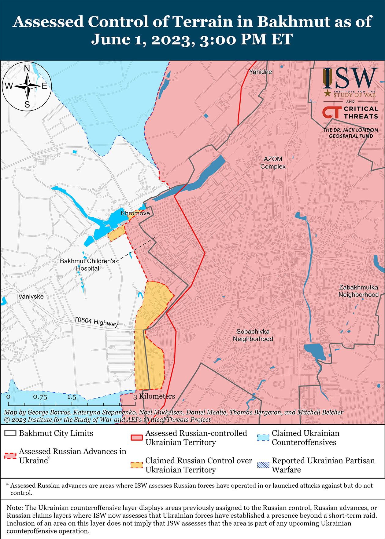 Темпы российских и украинских наступательных действий в районе Бахмута 1 июня остаются низкими. В Генштабе Украины сообщили, что российские военные вели безуспешные наступательные действия в районах населенных пунктов Орехово-Васильевка (11 км северо-восточного Бахмута) и Белая Гора (12 км юго-западнее Бахмута). Российский милблогер подтвердил, что российские войска отразили украинские силы в районе Берховского водохранилища (4 км к северо-западу от Бахмута). Командующий сухопутными войнами Украины генерал-полковник Александр Сырский согласился с тем, что российские войска перешли к обороне, сократизировали активные действия и усилили огонь артиллерии. 31 мая заместитель министра обороны Украины Анна Маляр сообщила, что украинские силы сохраняют контроль над юго-западными окраинами и выходом к Бахмуту.
