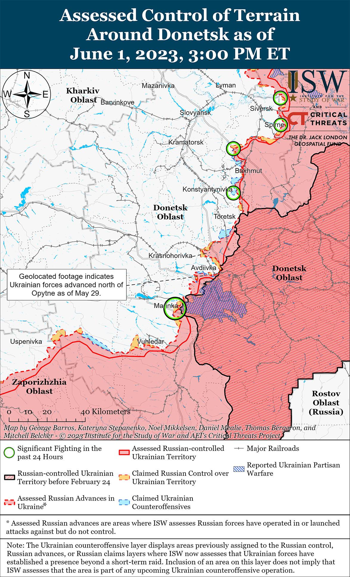 1 июня российские «Войска» провели ограниченные наземные атаки вдоль линии Авдеевка-Донецк. В украинском Генштабе сообщили, что российские войска не вели наступательных действий на Авдеевском направлении и что украинские силы отразили все атаки в районе Марьинки. 1 июня российский блогер заявил, что российская «Войска» продвинулась на северо-восток от Авдеевока, хотя ISW не выдал визуальных подтверждений, подтверждающих это подтверждение. Второй блогер подтвердил, что российскую «Войску» продвигали в направлении Северного (6 км западнее Авдеевки). В Минобороны России подтвердили, что подразделения 1-го армейского корпуса Донецкой Народной Республики (ДНР) вели наступательные действия в районе Авдеевки, а штурмовые подразделения 5-й мотострелковой бригады 1-го армейского корпуса и чеченского спецназа «Ахмат» продолжили наступательные действия на Марьинском направлении. По словам блогера, враг вел штурмовые действия в районах населенных пунктов Победа (5 км к юго-западу от Донецка) и Новомихайловка (10 км к юго-западу от Донецка). На кадрах, опубликованных 31 мая, видно, как 10-й танковый полк (3-й армейский корпус, Западный военный округ) действует на Авдейском направлении.