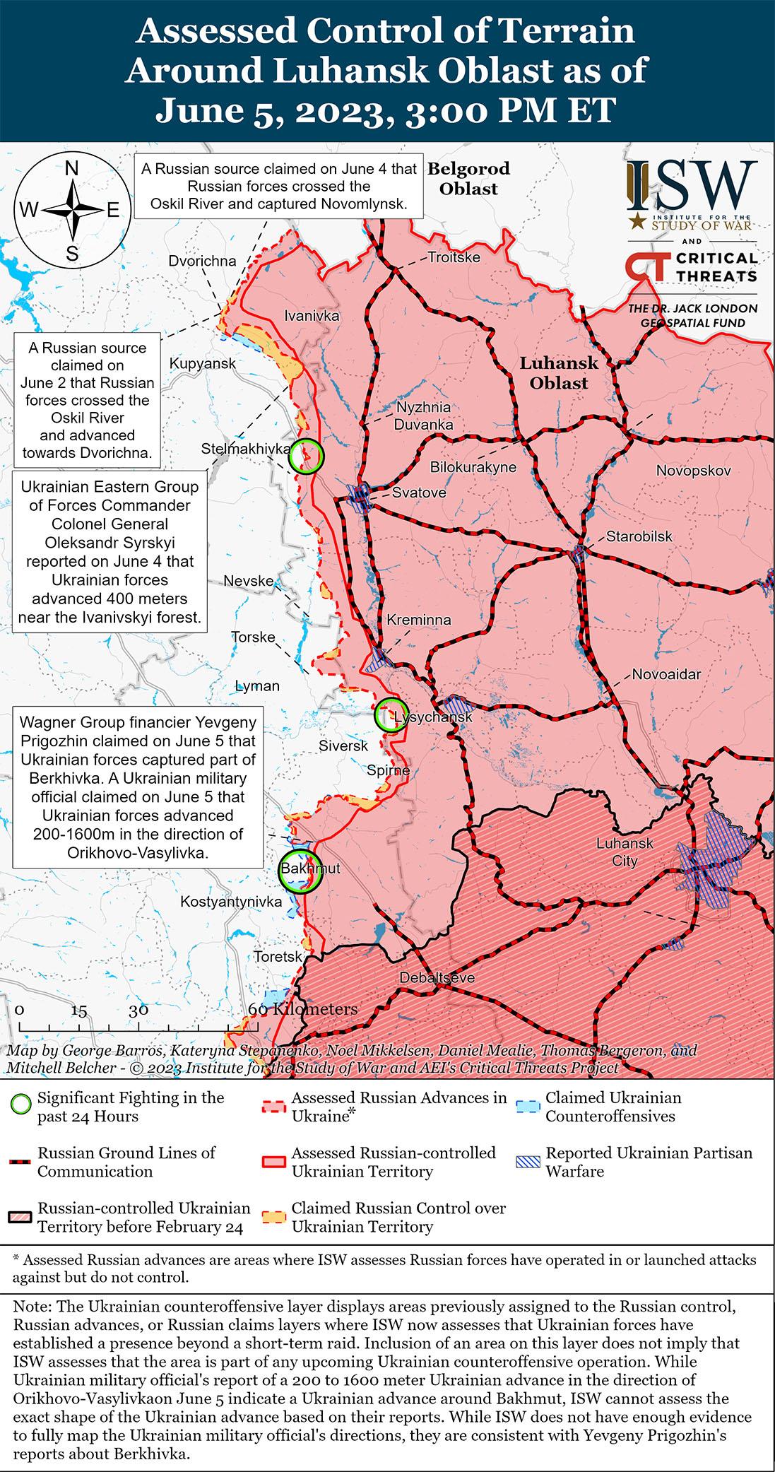 5 июня украинские силы предприняли ограниченное продвижение к северу и юго-западу от Бахмута. Маляр сообщила, что украинские силы ведут наступательные действия на восточном фронте в районе Бахмута и продвинулись на 200-1 600 метров в направлении Орехово-Васильевки (11 км к северо-западу от Бахмута) и на 100-700 метров вблизи Ивановского (6 км к западу от Бахмута) и Клещеевки (7 км к юго-западу от Бахмута). Спикер Восточной группы войск Украины полковник Сергей Череватый сообщил, что механизированные украинские силы также продвинулись с 300 метров до одного километра в направлении Зализнянское (13 км к северу от Бахмута) и Богдановки (8 км к северо-западу от Бахмута). 5 июня президент Украины Владимир Зеленский поблагодарил украинские силы на Бахмутском направлении за «продвижение вперед» в зонах ответственности. Финансист группы Вагнер Евгений Пригожин заявил, что украинские силы захватили неустановленную часть Берховки (6 км к северу от Бахмута), и раскритиковал российское военное командование за то, что 12 мая российские войска были отведены от Берховского водохранилища для защиты своих позиций в населенном пункте. Российские блогеры утверждали, что российские войска отразили украинские атаки в направлении Соледара (12 км к северо-востоку от Бахмута), вероятно, имея в виду более широкую территорию к северу и северо-востоку от Бахмута. Один милблогер утверждал, что российские войска вели бои с украинскими войсками возле Раздоловки (19 км к северо-востоку от Бахмута). Другой блогер утверждал, что украинские силы также атаковали российские позиции в неустановленном месте в районе Северска (31 км к северо-востоку от Бахмута). Российские блогеры утверждали, что российские войска отразили украинское наступление в районе Майорска (21 км к юго-западу от Бахмута) и к северу от Горловки (26 км к югу от Бахмута). ISW не наблюдал визуального подтверждения украинских успехов в Бахмуте, связанных с этими ограниченными наступательными операциями 5 июня.