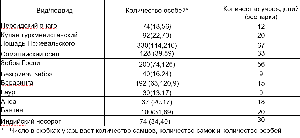 Следует отметить, что популяции всех вышеперечисленных видов ограничены возможностями зоопарков, которые медленно уменьшаются. В следующей таблице, показывающей их статус в европейских зоопарках (Таблица 1), показано, как популяции некоторых редких видов могут быть улучшены за счет возможности их увеличения за счет выпуска в европейские заповедники.