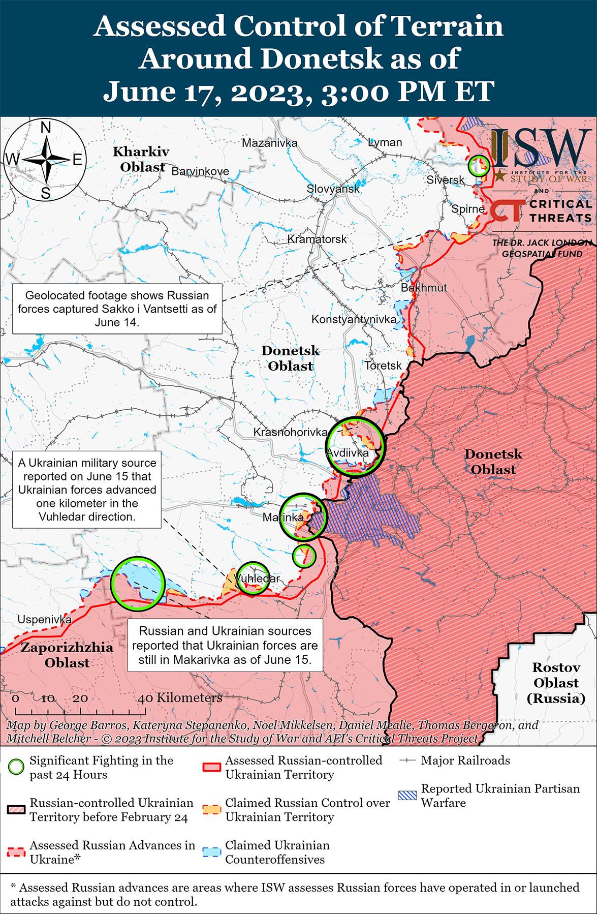 17 июня российские и украинские войска продолжили наземные атаки на линии Авдеевка-Донецк. Генштаб Украины сообщил, что украинские силы отразили наземные атаки российских войск вблизи Степового (2 км к северу от Авдеевки), Авдеевки и Марьинки (непосредственно к юго-западу от Донецка). Российские блогеры утверждали, что российские войска добились успехов к северу от Марьинки, атаковали юго-восток от Красногоровки (8 км к северу от Авдеевки) и консолидируют районы возле Победы (5 км к юго-западу от Донецка), которые, как сообщается, были захвачены за последнюю неделю. Российские блогеры также утверждали, что 13 июня украинские войска добились успехов в районе Невельское (16 км к юго-западу от Авдеевки), а 7 июня — в районе Водяное (17 км к юго-западу от Авдеевки). Министерство обороны России заявило, что российские войска отразили украинские контратаки вблизи Новокалиново (11 км к северо-западу от Авдеевки), Первомайского (11 км к юго-западу от Авдеевки) и Марьинки.