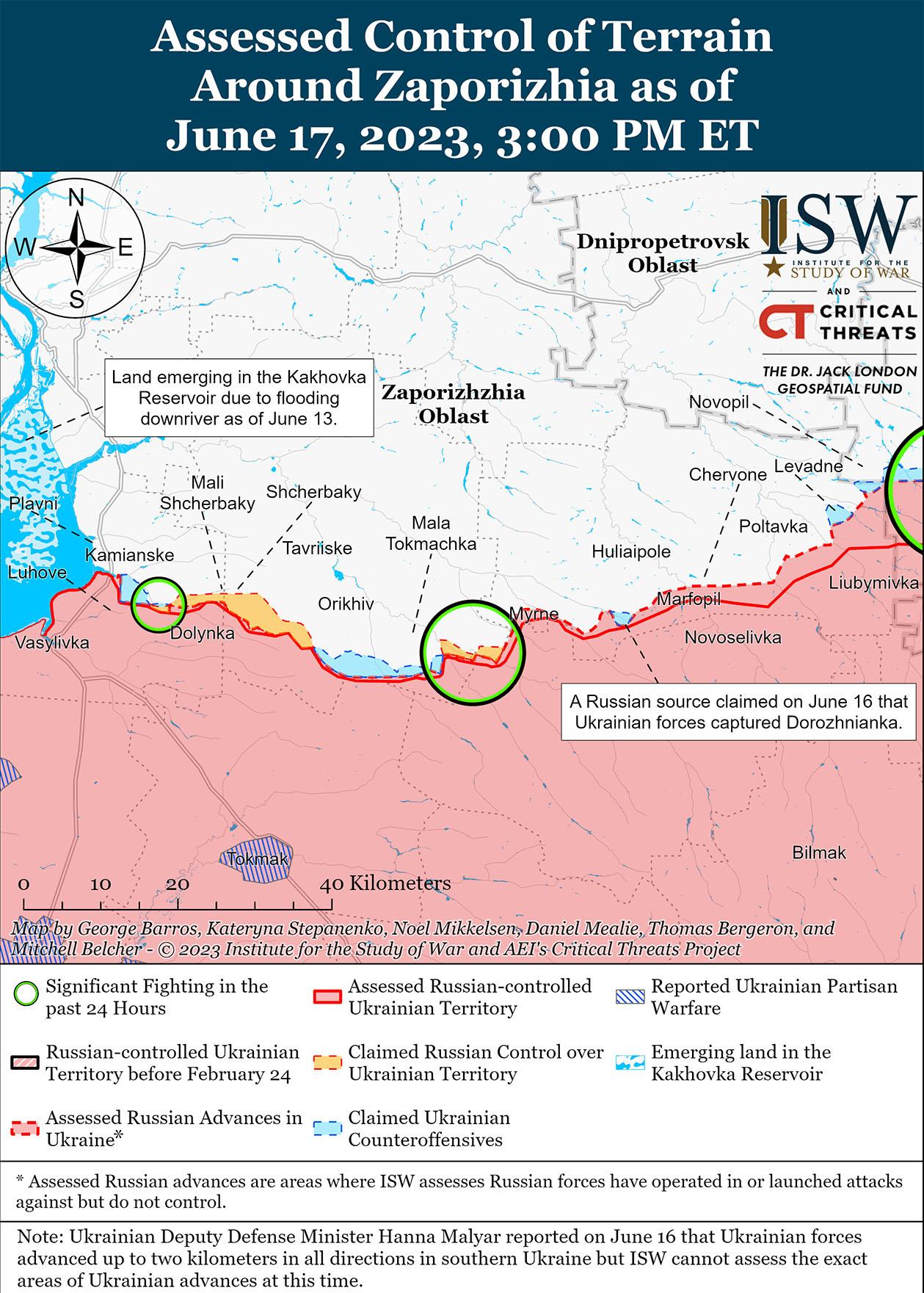 Российские источники утверждали, что украинские силы усилили атаки на западе Запорожской области 17 июня. Российские блогеры утверждали, что украинские военные атаковали вблизи Пятихаток (41 км к юго-востоку от Запорожья) и Новопокровки (16 км к юго-востоку от Орхова). Связанный с Кремлем военный блогер утверждал, что украинские войска вошли в Пятихатки, но к концу дня отступили на северную окраину населенного пункта. Другой связанный с Кремлем милблогер утверждал, что украинские силы захватили плацдарм на первой линии обороны к югу от Малой Токмачки (9 км к юго-востоку от Орехова), но подразделения российского 291-го мотострелкового полка и 70-го мотострелкового полка (оба из состава 42-й мотострелковой дивизии 58-й общевойсковой армии Южного военного округа) отразили наступление украинских войск в этом районе. Оккупационный чиновник Запорожской области Владимир Рогов также отметил, что подразделения 429-го мотострелкового полка (19-я мотострелковая дивизия, 58-я общевойсковая армия) обороняются от украинских атак на западе Запорожской области. Российские блогеры утверждали, что российские военные убили командира украинской механизированной бригады, но ISW не может подтвердить это утверждение на момент публикации.