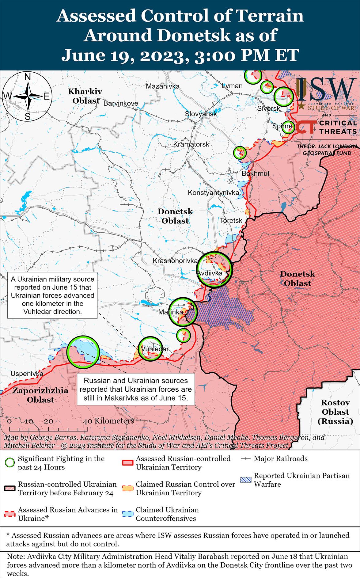 Российские и украинские войска провели ограниченные атаки на линии Авдеевка-Донецк и добились незначительных успехов по состоянию на 19 июня. Геолокационные кадры, опубликованные 18 июня, показывают, что как украинские, так и российские силы продвинулись в районе Победы (к юго-западу от Донецка), что указывает на то, что украинские силы продвинулись к юго-востоку от Победы, а российские — к югу от Победы. Генштаб Украины сообщил, что российские войска вели безуспешные наступательные действия вблизи Авдеевки, Красногоровки (8 км к северу от Авдеевки), Марьинки (непосредственно к юго-западу от Донецка), Победы и Новомихайловки (примерно в 30 км к юго-западу от Донецка). Российский блогер утверждал, что российские войска также атаковали вблизи Водяного (7 км к юго-западу от Авдеевки) и Степового (3 км к северо-западу от Авдеевки), а украинские силы незначительно продвинулись в районе Веселого (3 км к северо-востоку от Авдеевки). На геолокационных кадрах, опубликованных 18 июня, видно, как российские войска использовали танк Т-54 или Т-55 в качестве самодельного взрывного устройства (СВУ) возле Победы, но украинские силы уничтожили танк до того, как он достиг украинских позиций. Ранее российские военные использовали более старые автомобили в качестве заминированных автомобилей.