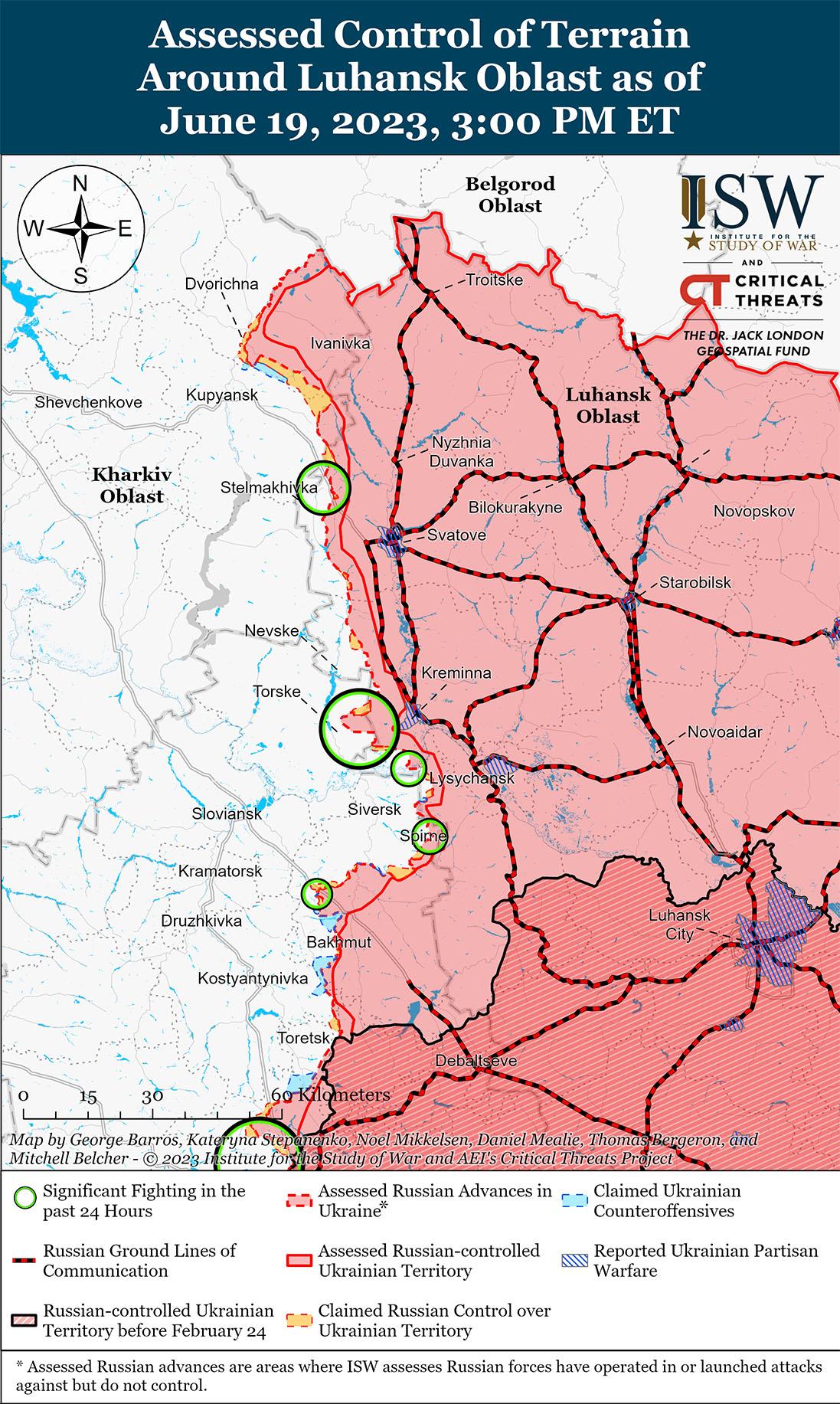 Российские войска добились успехов в районе Купянска и 19 июня продолжили наземные атаки вдоль линии Сватово-Кременная. На геолокационных кадрах, опубликованных 19 июня, видно, что российские войска продвинулись в северную часть Ольшаны (примерно в 15 км к северо-востоку от Купянска) в неустановленную дату. Кроме того, Генштаб Украины сообщил, что российские войска провели безуспешные наступательные действия вблизи Новоселовское (15 км к северо-западу от Сватово), Ямполевка (17 км к западу от Кременной), Торское (14 км к западу от Кременной), к западу от Дибровой (5 км к юго-западу от Кременной), Григоровка (10 км к югу от Кременной) и Спорное (25 км к югу от Кременной). Заместитель министра обороны Украины Анна Маляр отметила, что российские войска ведут активные наступательные действия вдоль линии Купянск-Лиман, стремясь вернуть инициативу. Один российский блогер утверждал, что подразделения 76-й гвардейской воздушно-десантной дивизии (ВДВ) вели наступательные действия под Кременной. Другой российский блогер утверждал, что украинские войска безуспешно пытались прорвать российские оборонительные рубежи в районе Кременной. Министерство обороны России заявило, что подразделения Центральной группировки войск отразили три украинские диверсионные группы к западу от Кременной.