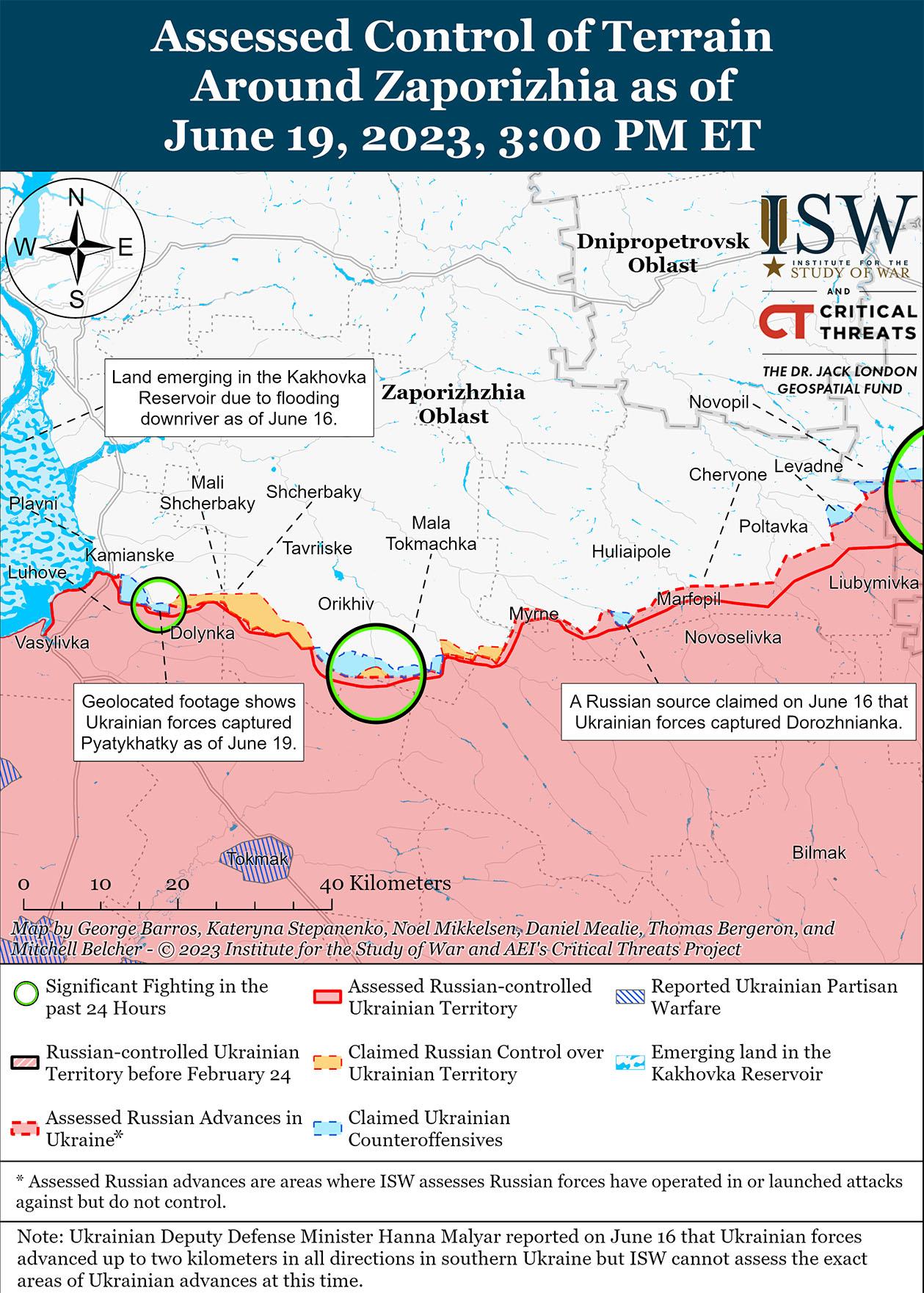 Украинские силы провели контрнаступательные операции как минимум на трех участках линии фронта и добились успехов 19 июня. Российский блогер сообщил, что украинские войска продолжали атаки к северо-западу, северо-востоку и юго-западу от Бахмута 19 июня, заявив, что украинские силы продвинулись в районе Краснополевки (примерно в 12 км к северо-востоку от Бахмута). Заместитель министра обороны Украины Анна Маляр дополнительно сообщила, что за прошедшую неделю украинские войска на Таврийскском (Запорожском) направлении продвинулись до семи километров и освободили 113 квадратных километров территории, в том числе восемь населенных пунктов на западе Донецкой и западе Запорожской областей. Российские блогеры утверждали, что украинские войска атаковали южнее Великой Новоселки на западе Донецкой области. Геолокационные кадры, опубликованные 19 июня, подтверждают, что украинские войска освободили Пятихатки, расположенное примерно в 25 км к юго-западу от Орехова на западе Запорожской области. Военные блогеры также сообщали о боях к югу и юго-западу от Орехова в течение дня 19 июня. 19 июня Министерство обороны (МО) Великобритании оценило, что Россия, вероятно, перебросила значительную часть Днепровской группировки войск с восточного (левого) берега Херсонской области на Запорожское и Бахмутское направления для реагирования на контрнаступательные действия Украины за последние 10 дней.