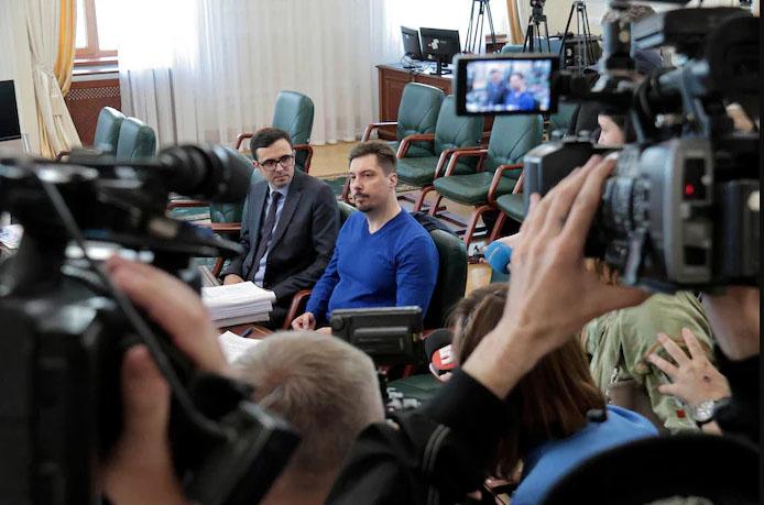 Всеволод Князев, бывший глава Верховного суда Украины, в центре справа, и его адвокат присутствуют на слушаниях в Высшем совете правосудия в прошлом месяце в Киеве. Князева обвиняют в участии в схеме взяточничества на сумму 2,7 миллиона долларов. (Абака Пресс / Сипа США / AP)