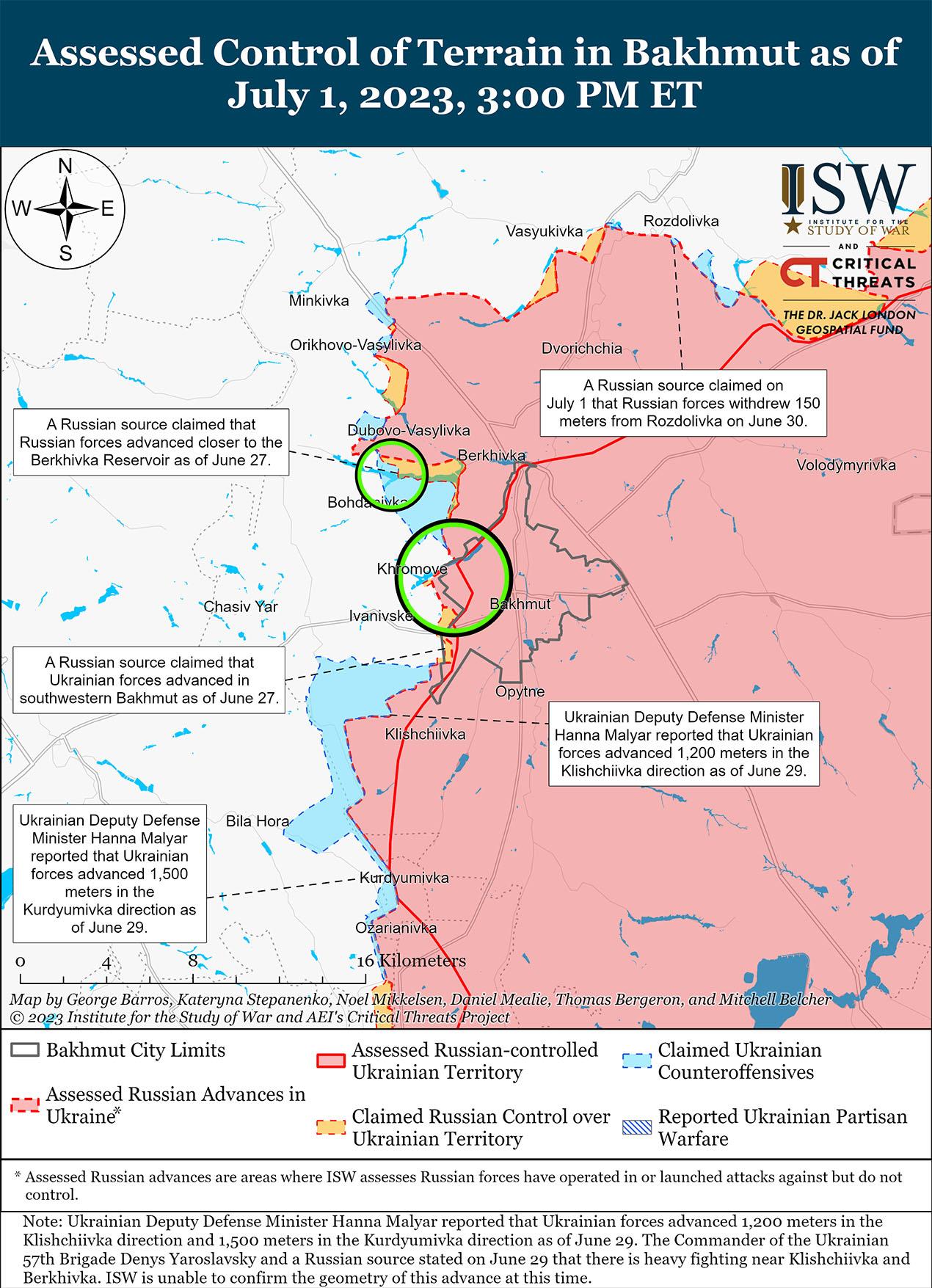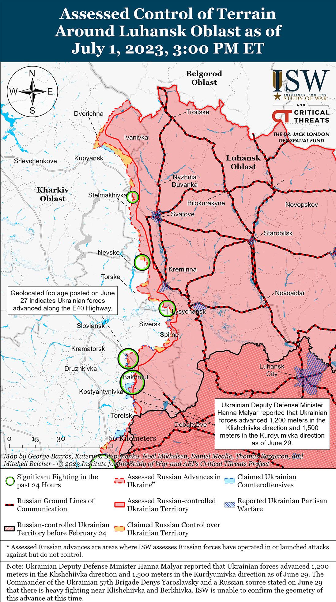 Российские источники утверждали, что 1 июля украинские силы провели контрнаступательные операции как минимум на четырех участках линии фронта. Министерство обороны России заявило, что российские войска отразили украинские атаки в районе Бахмута и вдоль фронта Авдеевка-Донецк. Российские блогеры утверждали, что украинские силы добились незначительных успехов вблизи Раздоловка (18 км к северу от Бахмута) и неустановленных успехов вблизи Клещеевка (7 км к юго-западу от Бахмута). Российские источники утверждали, что украинские силы продолжали наступательные действия вдоль административной границы между Запорожской и Донецкой областями и добились успехов к юго-западу от Великой Новоселки. Российские источники утверждали, что украинские силы проводили наступательные действия к югу и юго-западу от Орехова на западе Запорожской области, при этом один из блогеров утверждал, что украинские силы добились успехов на глубине 1,5 км и ширине 6 км в направлении Роботино (12 км к югу от Орехова). Другие блогеры утверждали, что по состоянию на 1 июля украинские силы все еще находятся на расстоянии не менее 5,1 км к северу от Роботино, что согласуется с текущей оценкой ISW контроля местности в этом районе.
