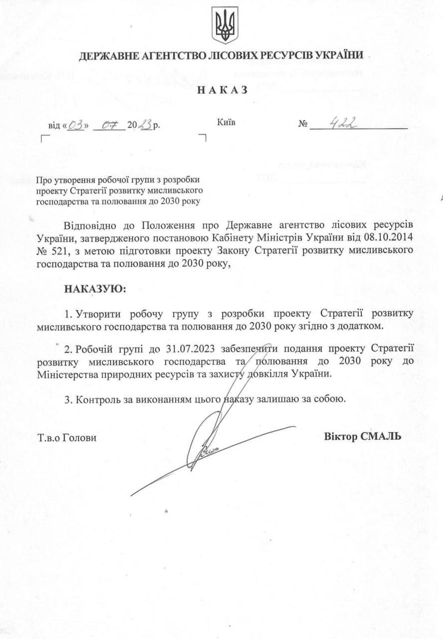 За повідомленням Телеграмканалу Міністерство лісу 03 липня 2023офіційно утворена й затверджена відповідним наказом Державного агентства лісових ресурсів Робоча група з розробки проєкту Стратегії розвитку мисливського господарства та полювання України до 2030 року!