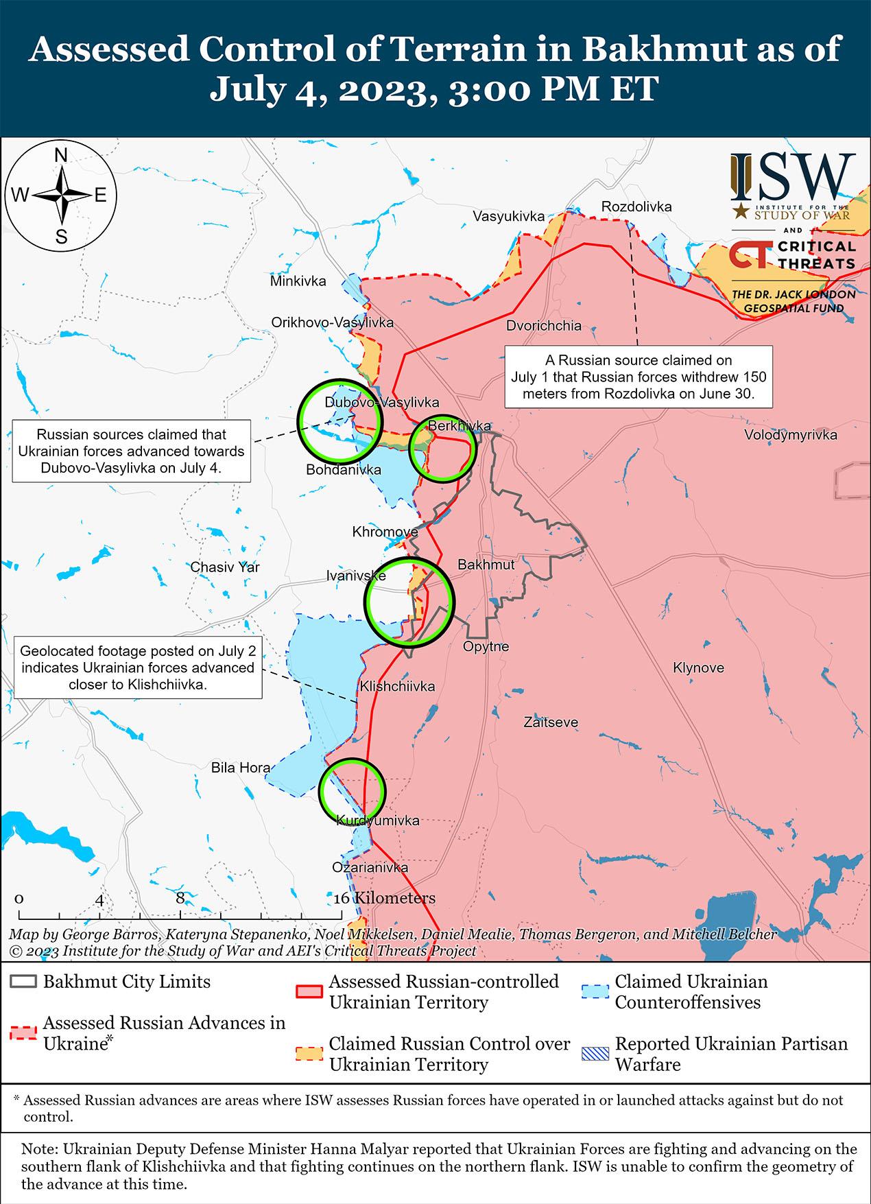 4 июля российские и украинские войска усилили наземные атаки в районе Бахмута. Заместитель министра обороны Украины Анна Маляр сообщила, что ситуация в Бахмуте обострилась, и что российские и украинские силы ведут дуэли за инициативу и контроль над местностью. Маляр также сообщила, что украинские войска продвигаются на южном фланге Клещеевки (7 км к юго-западу от Бахмута) и что бои продолжаются на северном фланге Клещеевки. Генштаб Украины сообщил, что украинские силы отразили девять российских атак вблизи Григоровки (8 км к северо-западу от Бахмута), Богдановки (5 км к северо-западу от Бахмута), Ивановского (6 км к западу от Бахмута), к западу от Ягодного (2 км к северу от Бахмута) и к юго-востоку от Белой Горы (15 км к юго-западу от Бахмута). Генштаб также сообщал, что украинские силы вели наступательные действия к северу и югу от Бахмута, закрепляясь на новых позициях. Российские блогеры утверждали, что украинские войска продвинулись вблизи Дубово-Васильевки (6 км к северо-западу от Бахмута). Российский блогер также утверждал, что украинские войска вели наступательные действия вблизи Клещеевки, Озаряновки (16 км к юго-западу от Бахмута) и Курдюмовки (12 км к юго-западу от Бахмута). По словам блогера, российские войска удерживали позиции и контратаковали из Берховка (6 км к северу от Бахмута) и вдоль трассы М-03 в направлении Миньковка (13 км к северо-западу от Бахмута). По данным Минобороны России, подразделения Южной группировки войск отразили 10 украинских атак вблизи Орехово-Васильевка (11 км к северо-западу от Бахмута), Ягодного и Клещевки.