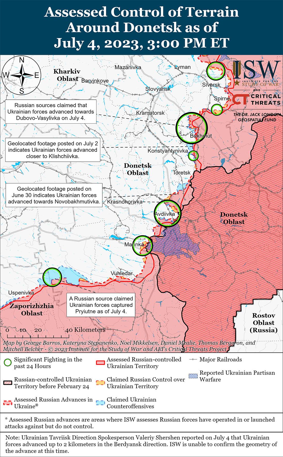 Украинские силы продолжали контрнаступательные действия как минимум на четырех участках фронта и 4 июля продвинулись вперед. В Минобороны России заявили, что российские силы отразили украинские наземные атаки на Лиманском направлении. Генштаб Украины сообщил, что украинские силы продолжают контрнаступательные действия в районе Бахмута, на западе Донецко-Запорожской области и на западе Запорожской области. Украинские военные чиновники заявили, что украинские силы добились неопределенных успехов на северном и южном флангах Бахмута, а известный российский блогер также заявил, что украинские войска продвинулись к северу от Бахмута. Пресс-секретарь украинской группировки войск «Таврийск» Валерий Шершен заявил, что украинские силы продвинулись на два километра в западной части границы Донецкой и Запорожской областей, а российский блогер заявил, что украинские войска достигли Приютного, в 15 километрах к юго-западу от Великой Новоселки на западе Донецкой области. Геолокационные кадры подтверждают, что украинские войска продвинулись к югу от Орехова на западе Запорожской области.