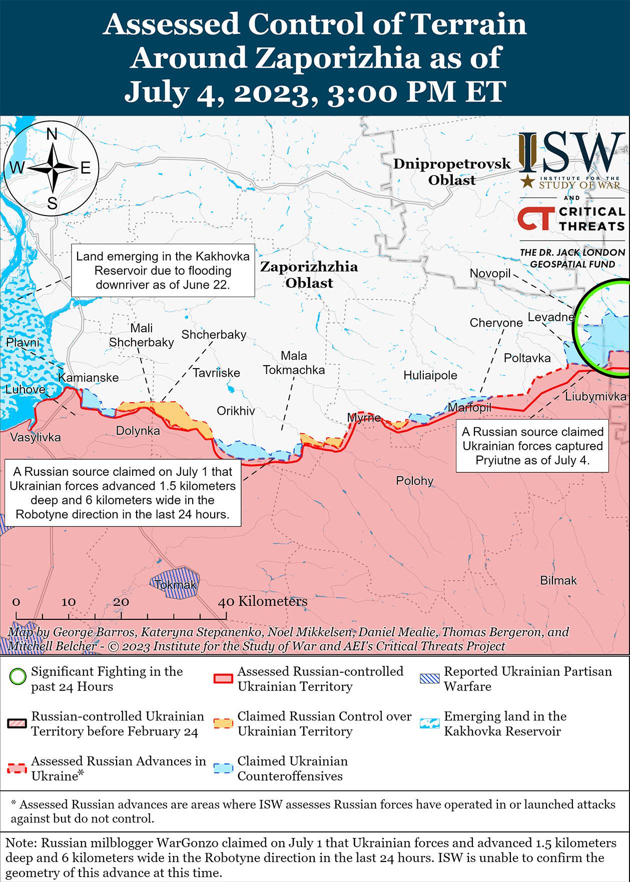 - Украинские силы продолжали контрнаступательные действия как минимум на четырех участках фронта и 4 июля продвинулись вперед.