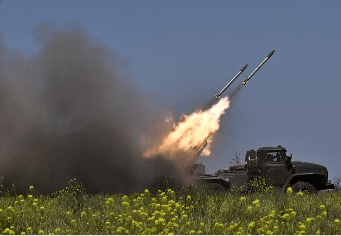 Запуск реактивных снарядов среди поля. Отражая российское вторжение украинские военнослужащие из 57-й бригады стреляют снарядами БМ-21 «Град» по российским позициям на линии фронта недалеко от Бахмута (Донецкая область, 20 июня 2023 года). Геня Савилов/AFP