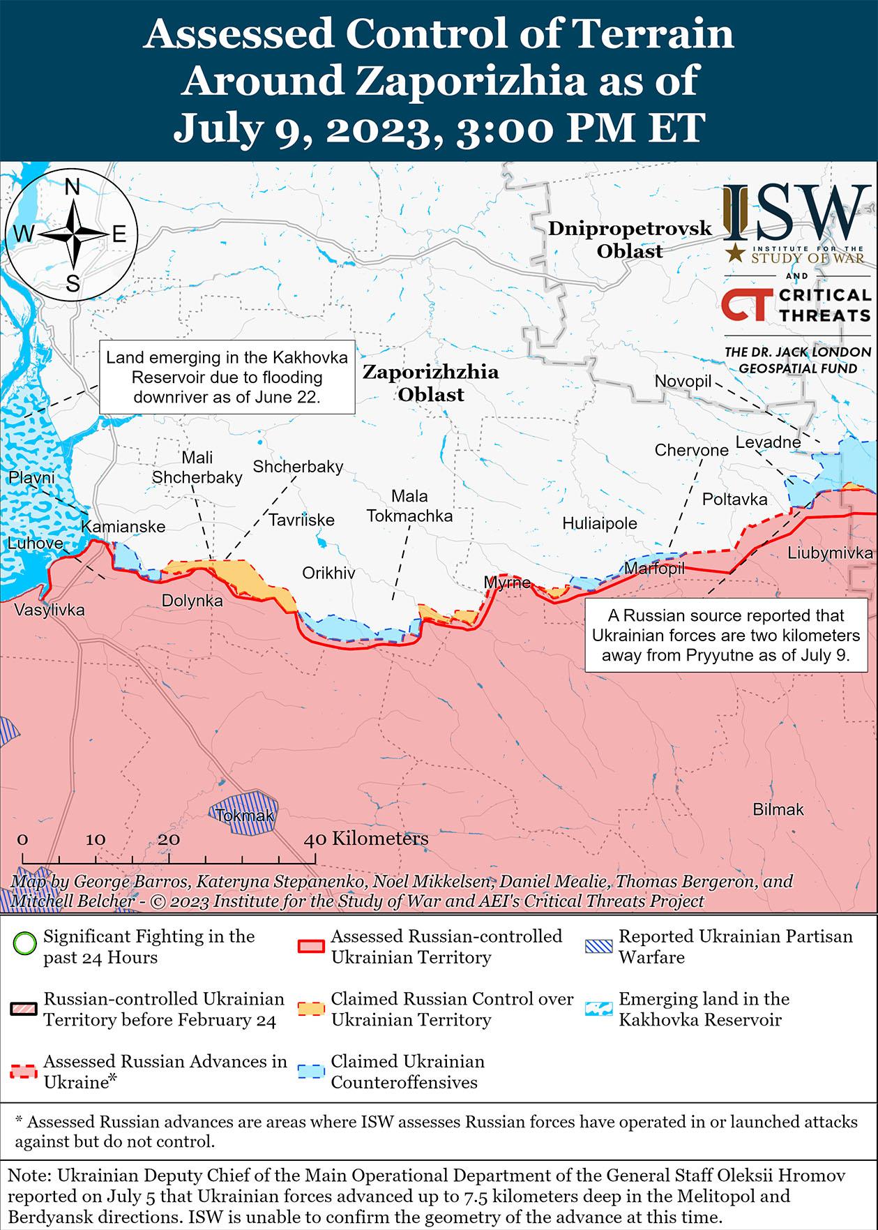 9 июля украинские силы продолжали вести контрнаступательные действия на западе Запорожской области. Министерство обороны России заявило, что российский добровольческий батальон «Восток» и российская артиллерия, ракетные и авиационные удары отразили украинские атаки вблизи Роботино (15 км к югу от Орехова), Новоданиловки (6 км к юго-востоку от Орехова) и Малой Токмачки (9 км к юго-востоку от Орехова). Связанный с Кремлем блогер заявил, что украинские силы продолжали атаки в направлении Роботино, но успеха не имели. Другой связанный с Кремлем военный блогер утверждал, что украинская штурмовая группа прорвала российскую оборону на стыке между неустановленными российскими полками к северо-востоку от Роботино и что продолжаются бои за контроль над позициями 7-й роты 71-го гвардейского мотострелкового полка (42-я мотострелковая дивизия 58-й общевойсковой армии Южного военного округа). Российские источники утверждали, что украинские силы вывели личный состав из Пятихатки (25 км к юго-западу от Орехова), но отметили, что украинские силы сохраняют позиции между Жеребянки (27 км к юго-западу от Орехова) и Пятихатками. На момент публикации ISW не обнаружил визуальных доказательств, подтверждающих российские утверждения. Российский источник указал, что подразделения российского добровольческого отряда БАРС-1 (Русский боевой армейский резерв) действуют в составе 70-го гвардейского мотострелкового полка (42-я мотострелковая дивизия, 58-я общевойсковая армия, ЮВО) вместе с операторами беспилотников из отряда «Царские волки» на Запорожском направлении. Российский источник также отметил, что на Запорожском направлении воюют подразделения российского спецназа «Осман».