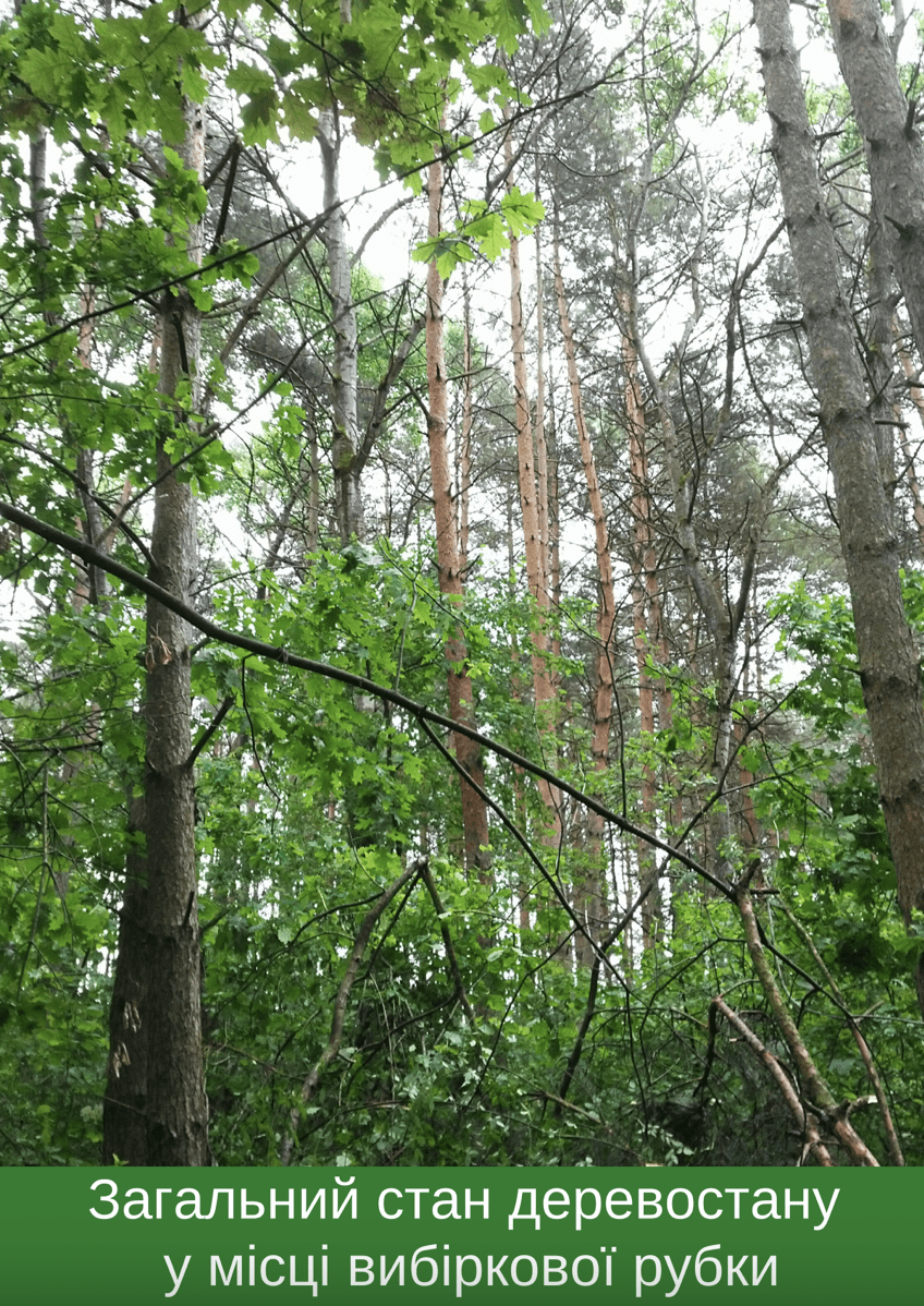 “Всихаючі дерева, а тим паче сухі — відсутні; хвоя стоячих і зрубаних дерев є темно-зеленою, а не “рудою”, як зазначено в акті лісопатологічного обстеження; кора не відслоюється, а щільно прилягає до стовбура дерева; механічно пошкоджені ділянки смоляться, що вказує зовсім не на всихання дерева! Вітер насадження не пошкодив, зломів та нахилів стовбура понад 30 градусів від вертикальної осі немає. Водночас на ділянці залишені дерева, які варто було б зрубати”, — констатують експерти.
