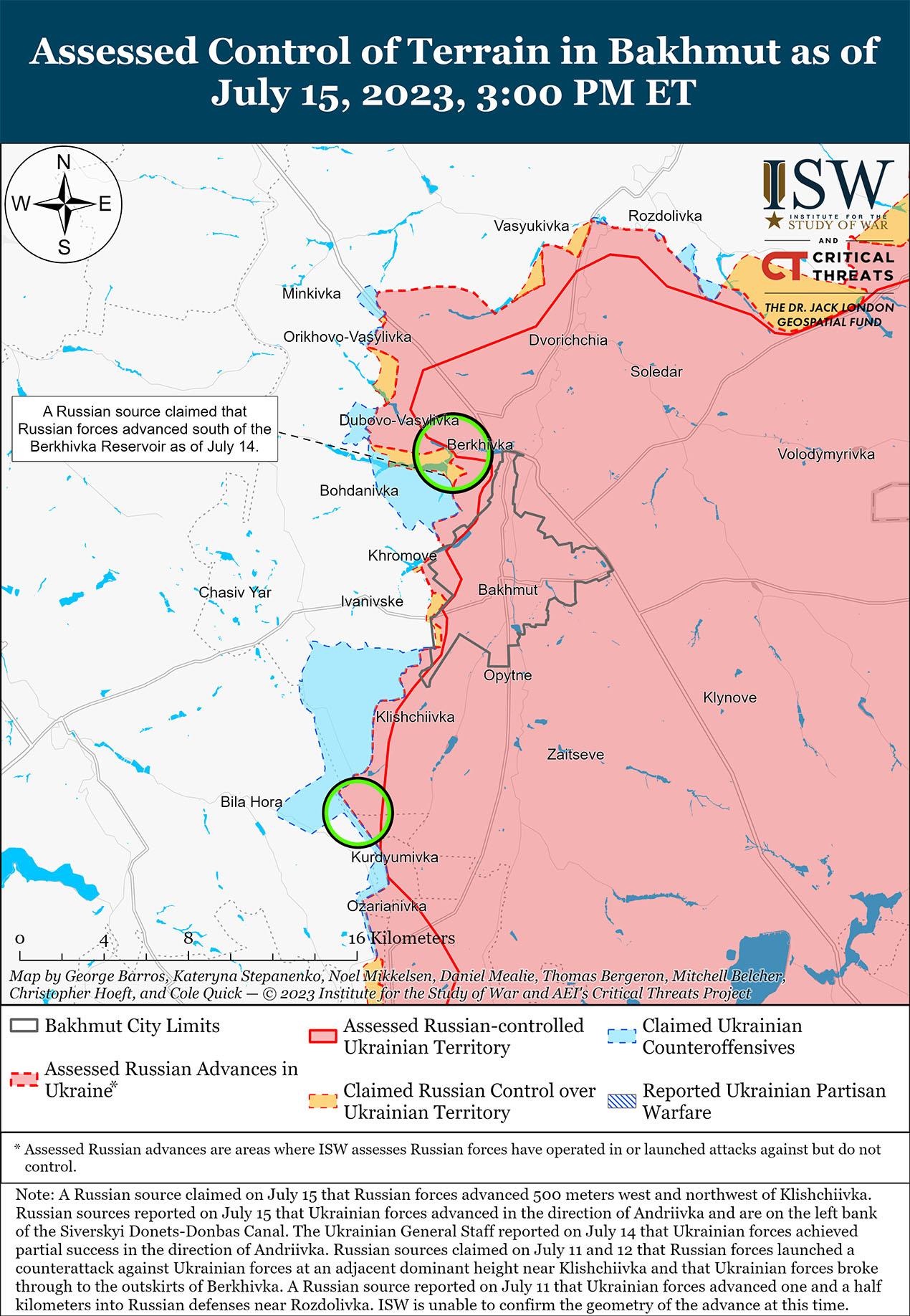 Сообщается, что украинские силы добились ограниченных территориальных успехов на южном фланге Бахмута, поскольку 15 июля позиционные бои продолжались в других местах вдоль линии фронта в Бахмуте. Связанный с Кремлем военный блогер заявил, что украинские войска продвинулись возле Андреевки (10 км к югу от Бахмута) и пересекли канал Северский Донец-Донбасс. Другой российский источник утверждал, что украинские силы продвинулись в направлении Курдюмовки (15 км к юго-западу от Бахмута), в то время как Министерство обороны России также утверждало, что российская Южная группа войск отражала украинские атаки на Курдюмовку. Российские источники утверждали, что украинские силы продолжали атаковать российские позиции возле Клещеевки (7 км к юго-западу от Бахмута) и безуспешно пытались вернуть позиции в районе Берховки (6 км к северу от Бахмута). Милблогер отметил, что в районах Берховки и Раздоловки (16 км к северо-востоку от Бахмута) ситуация практически не изменилась, а несколько российских блогеров заявили, что в районе Клещеевки продолжаются интенсивные бои. Спикер Восточной группировки войск Украины полковник Сергей Череватый отметил, что украинские силы сохраняют инициативу на Бахмутском направлении.