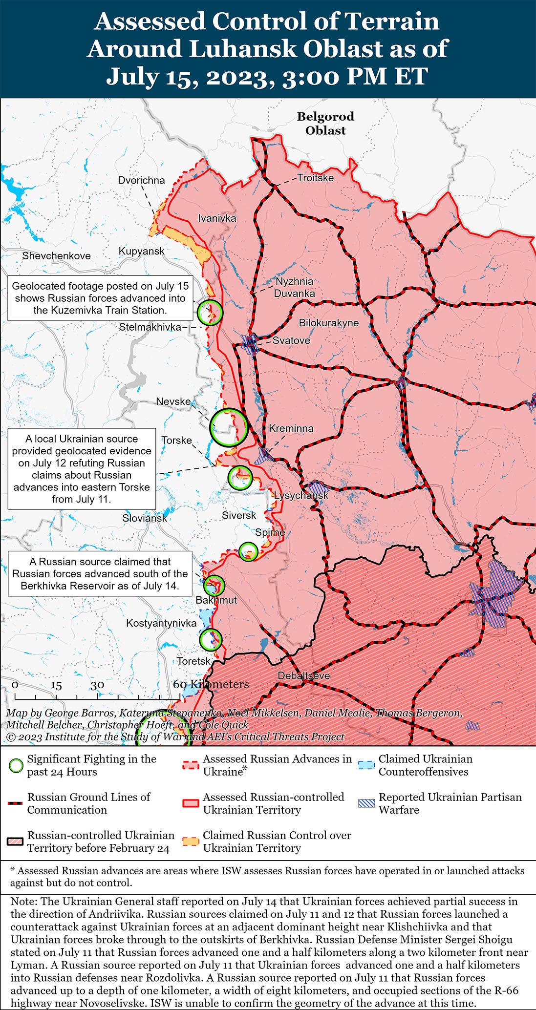 Российские войска провели наступательные действия в районе Кременной и, как сообщается, 15 июля добились ограниченных территориальных завоеваний. Украинский Генштаб и Череватый сообщили, что российские войска провели неудачные наступательные действия к востоку от Новосадово (17 км к северо-западу от Кременной), к западу от Диброва и к востоку от Веселого (30 км к югу от Кременной). Министерство обороны России заявило, что российские войска отразили две украинские атаки вблизи Макеевки (22 км к северо-западу от Кременной) и Торского (15 км к западу от Кременной). Российский блогер утверждал, что российские войска продвинулись вблизи Торского и в лесах под Кременной. Связанный с Кремлем военный блогер заявил, что российские войска продвинулись в направлении Ямполевка (17 км к западу от Кременной), но на данный момент достоверной информации о контроле местности вокруг Торского нет. Другой блогер опубликовал кадры, на которых, как утверждается, видно, как военнослужащие 228-го мотострелкового полка (90-я танковая дивизия, 41-я общевойсковая армия, Центральный военный округ) вместе с неустановленными элементами чеченского разведывательного подразделения «Ахмат» атакуют украинские позиции под Кременной.