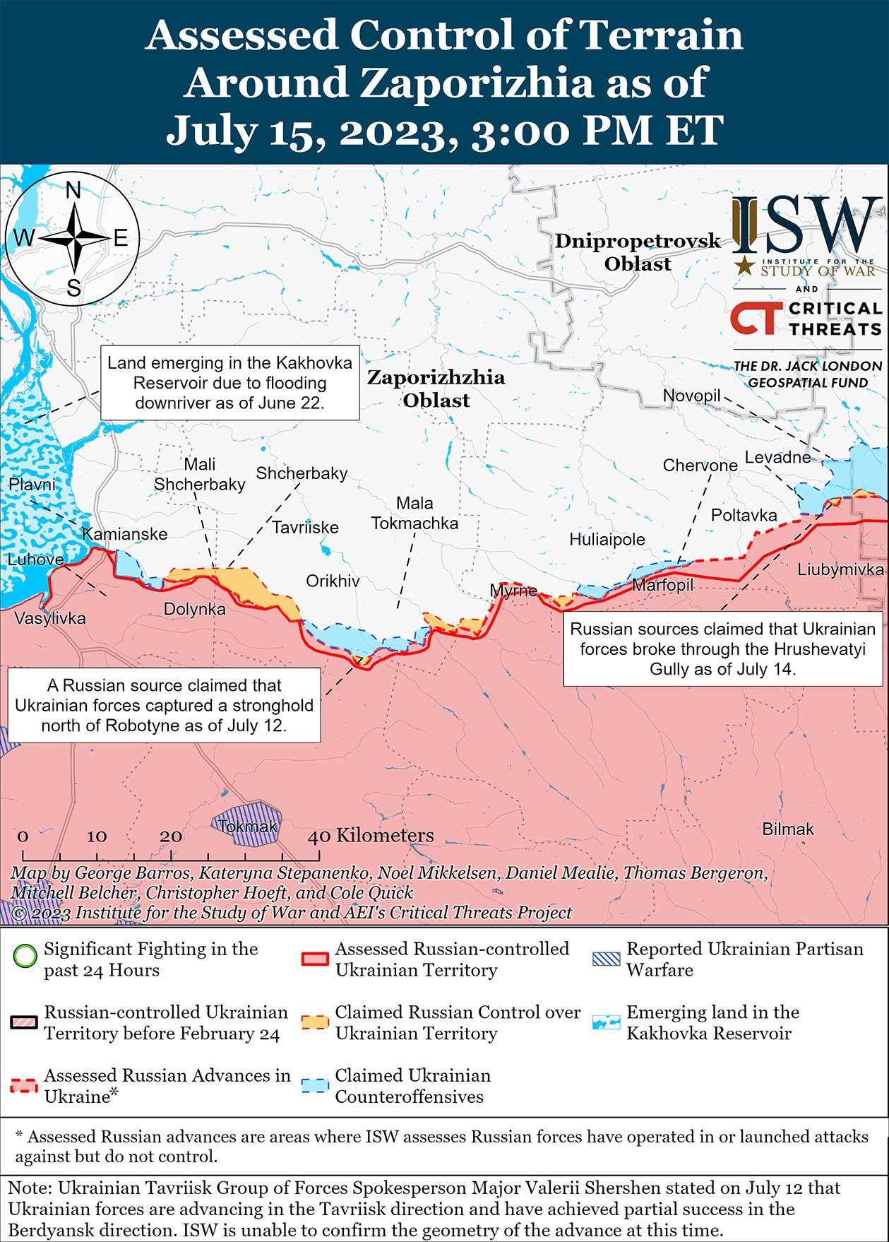 15 июня украинские силы провели контрнаступательные операции по меньшей мере на трех участках фронта и, как сообщается, добились ограниченных успехов. Российские источники утверждали, что украинские силы добились ограниченных успехов к югу от Бахмута возле Андреевки (10 км к югу от Бахмута) и пересекли Северский Донецкий канал в этом районе. Российские источники также утверждали, что украинские силы добились ограниченного прогресса в западной части границы Донецкой и восточной части Запорожской области к юго-западу от Великой Новоселки и в западной части Запорожской области к северо-востоку от Роботино (12 км к югу от Орехова). Российский блогер заявил, что российские войска «постоянно» перебрасывают подкрепления в район Бахмута, а недавно перебросил неустановленное подразделение БАРС (российский боевой резерв) из района Кременной в район Клещеевки (7 км к юго-западу от Бахмута), что указывает на то, что украинские контрнаступательные операции продолжают вызывать переброску российских войск в район Бахмута. Командующий украинской Таврической группировкой войск бригадный генерал Александр Тарнавский заявил в интервью CNN, опубликованном 14 июля, что контрнаступление успешно, но признал, что темпы наступления украинцев медленнее, чем ожидалось. Тарнавский заявил, что украинские силы эффективно побеждают российские войска на больших расстояниях, вероятно, имея в виду продолжающиеся украинские кампании по перехвату на востоке и юге Украины. Тарнавский также сообщил, что украинские военные получили кассетные боеприпасы, которые могут «радикально изменить [поле боя]», и до сих пор их не применяли.