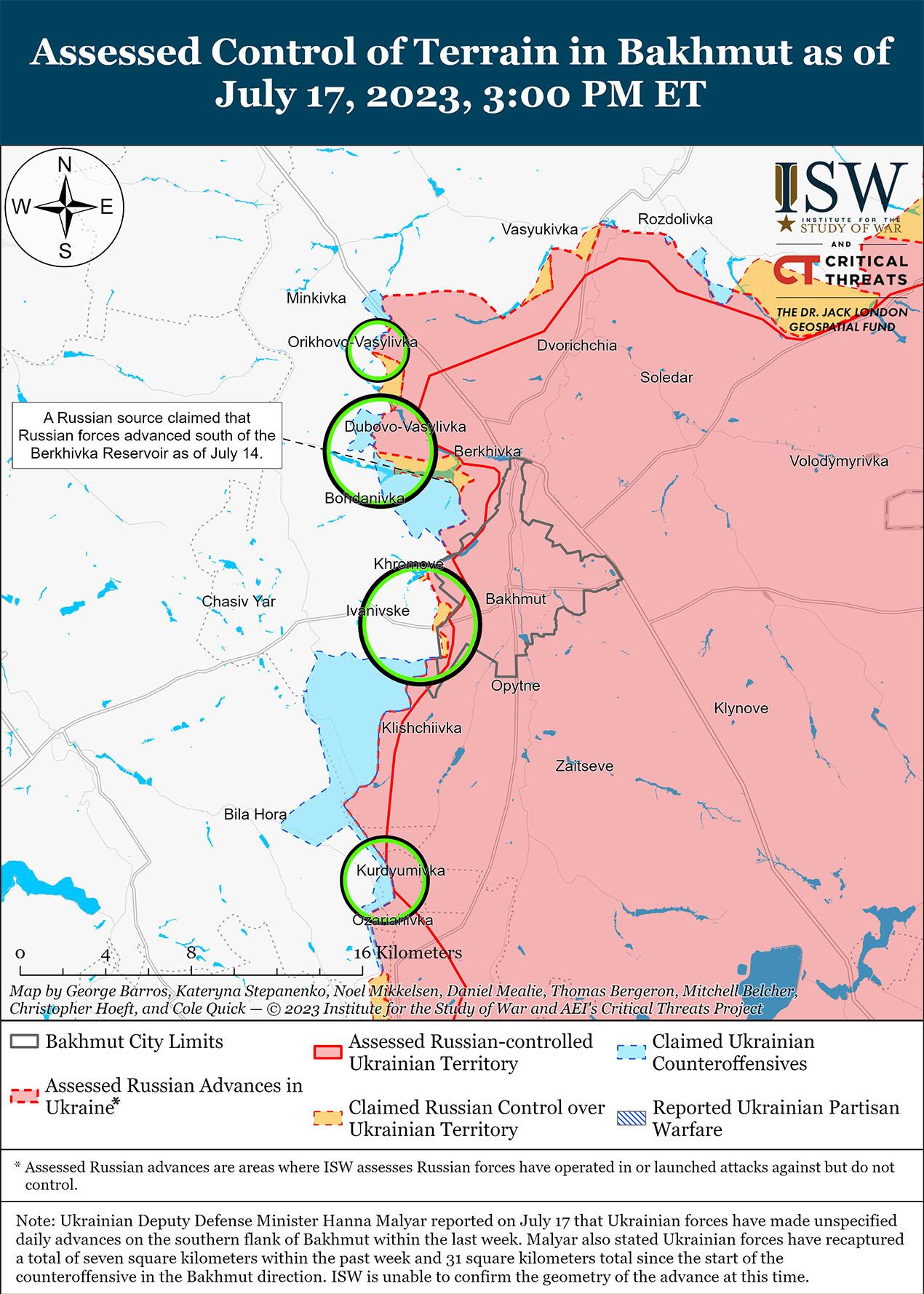 Украинские силы продолжали контрнаступательные операции в районе Бахмута 17 июля и, вероятно, добились ограниченных успехов. Заместитель министра обороны Украины Анна Маляр заявила, что украинские силы продвинулись в неустановленных местах на южном фланге Бахмута. Вагнеровский командир «Лотос» заявил в интервью связанному с Вагнер военному блогеру, что украинские силы захватили опорный пункт севернее Клещеевки и установили огневой контроль над населенным пунктом. «Лотос» утверждает, что украинские силы также контролируют районы к северу от Бахмута в районе Железнянского (9 км к северо-западу от Бахмута), Берховское водохранилище (4 км к северо-западу от Бахмута), неустановленный участок железной дороги к северу от Бахмута, наземные линии коммуникаций (НЛК) вдоль трассы Часов Яр – Хромово и возвышенности вокруг Клещеевки. «Лотос» сообщил, что украинские силы пытаются захватить Яковловку (14 км к северо-востоку от Бахмута), чтобы перекрыть российские пути сообщения с Соледаром (12 км к северо-востоку от Бахмута), где идут ожесточенные бои. Другой военный блогер утверждал, что украинские силы безуспешно пытались прорваться в Клещеевку с запада и северо-запада, но украинские силы вернули утраченные позиции в районе Орехово-Васильевка у трассы Е40 (Бахмут-Славянск).