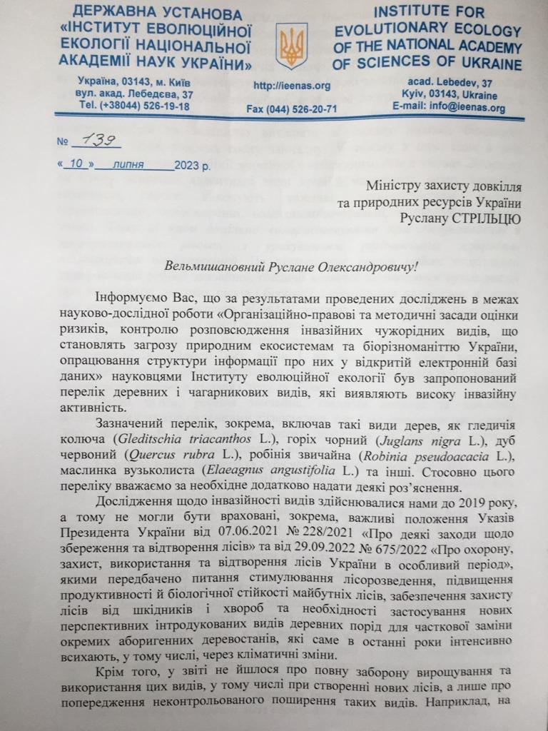 Щоб запобігти катастрофі, автори звіту звернулись до міністра Руслана Стрільця.Вчені звертають увагу, що в звітні НЕ ЙШЛОСЯ ПРО ПОВНУ ЗАБОРОНУ ВИРОЩУВАННЯ ТА ВИКОРИСТАННЯ ПЕВНИХ ВИДІВ ДЕРЕВ, В ТОМУ ЧИСЛІ ПРИ СТВОРЕННІ НОВИХ ЛІСІВ!!! Наприклад, домішок дубу червоного та горіху чорного лише сприяє посиленню стійкості лісових екосистем.На додаток під заборону попали цінні лікарські та медоносні рослини!Викладаємо повністю текст листа шановних науковців. І очікуємо від Міндовкілля оперативного реагування та внесення змін у наказ.