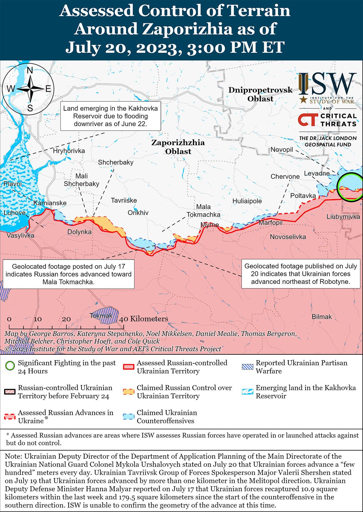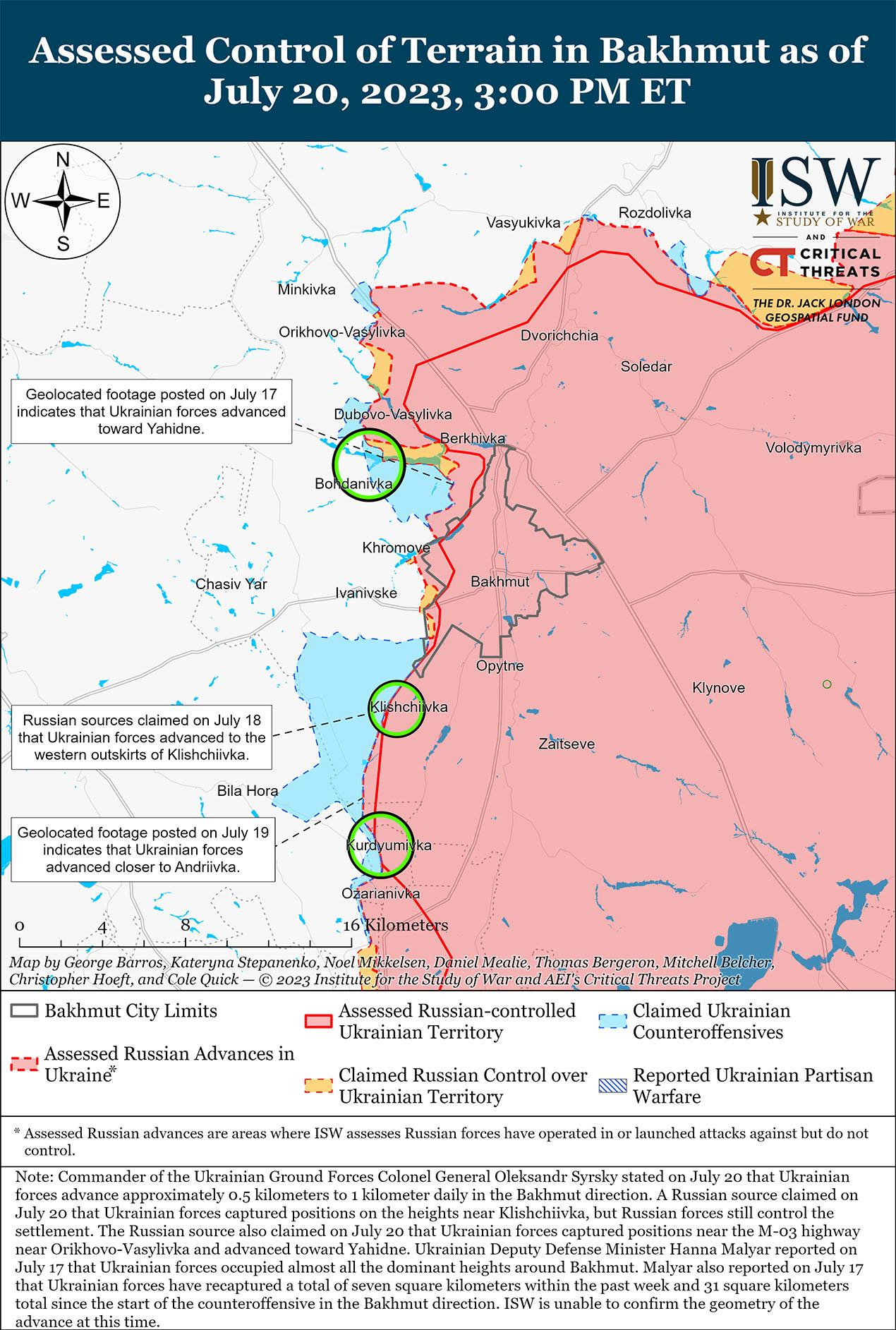 Украинские силы продолжали контрнаступательные действия как минимум на трех участках фронта и, как сообщается, продвинулись вперед 20 июля. Украинский командир, действующий в районе Бахмута, сообщил 19 июля, что украинские силы продвинулись на 1,8 км, вероятно, на южном фланге Бахмута, а российские военные блогеры утверждали, что украинские силы также продвинулись на северном фланге Бахмута 20 июля. Командующий Сухопутными войсками Украины генерал-полковник Александр Сырский заявил, что украинские силы не могут быстро продвинуться в районе Бахмута из-за сильной концентрации российских войск в этом районе. Российское военное командование сосредоточило большую плотность сил в районе Бахмута для защиты от украинских атак в этом районе, что, вероятно, было преднамеренным эффектом этих атак, хотя Сырский и другие украинские официальные лица неоднократно заявляли о своем намерении вернуть Бахмут. Украинские военные сообщили, что украинские войска продолжают продвигаться на Бердянском (приграничный район Донецкой и Запорожской областей) и Мелитопольском (запад Запорожской области) направлениях и продолжают продвигаться примерно на 100 метров в сутки к югу и юго-востоку от Орехова. Советник президента Украины Михаил Подоляк подтвердил, что украинское контрнаступление будет медленным и трудным, но не позволит российским войскам вернуть себе инициативу на поле боя. The Washington Post сообщила, что украинские силы начали использовать предоставленные Западом кассетные боеприпасы на юго-востоке Украины, и оценила, что украинские силы, вероятно, скоро будут использовать их под Бахмутом. The Washington Post со ссылкой на анонимного украинского военного чиновника сообщила, что украинские силы используют кассетные боеприпасы для обеспечения «прорыва [российских] окопов, замедляющих продвижение украинских сил».