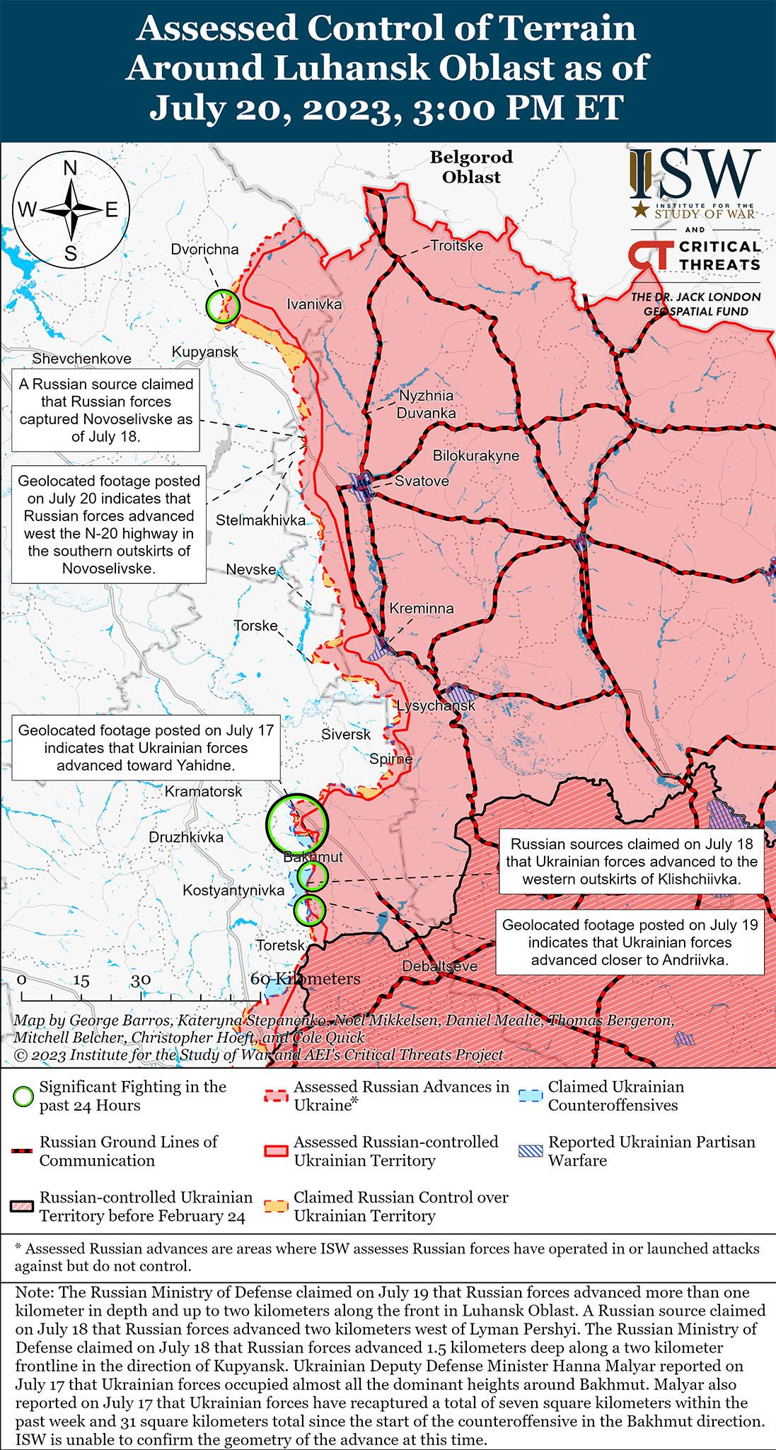 - Украинские силы продолжали ограниченные наступательные действия к востоку от Купянска, возле Кременной, возле Бахмута и вдоль линии Авдеевка — Донецк и 20 июля добились успехов в районе Бахмута.