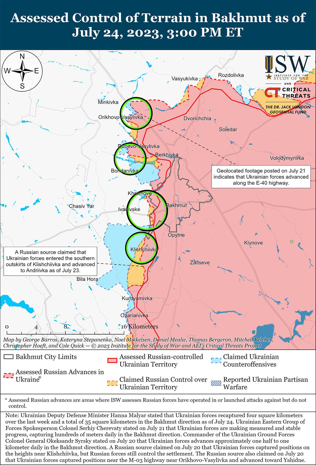 Украинские силы провели контрнаступательные операции к северу и югу от Бахмута и, как сообщается, продвинулись вперед по состоянию на 24 июля. Заместитель министра обороны Украины Анна Маляр сообщила, что за последнюю неделю украинские силы освободили четыре квадратных километра на Бахмутском направлении и что украинские силы продолжают медленно, но уверенно продвигаться вперед. 23 июля связанный с Кремлем блогер заявил, что украинские войска продвинулись на Орехово-Васильевском направлении, вошли на окраины Клещеевки и продвинулись вплотную к Андреевке (10 км к юго-западу от Бахмута), а другой российский блогер 24 июля заявил, что украинские войска заняли позиции на высотах возле Клещеевки. Российские источники утверждали, что вблизи Клещеевки продолжаются интенсивные бои, а Минобороны России утверждало, что российские войска отразили украинские атаки возле Клещеевки. Российский блогер заявил, что российские войска испытывают значительные трудности с обороной позиций на южном фланге Бахмута из-за отсутствия ротации и эффективной украинской радиоэлектронной борьбы.