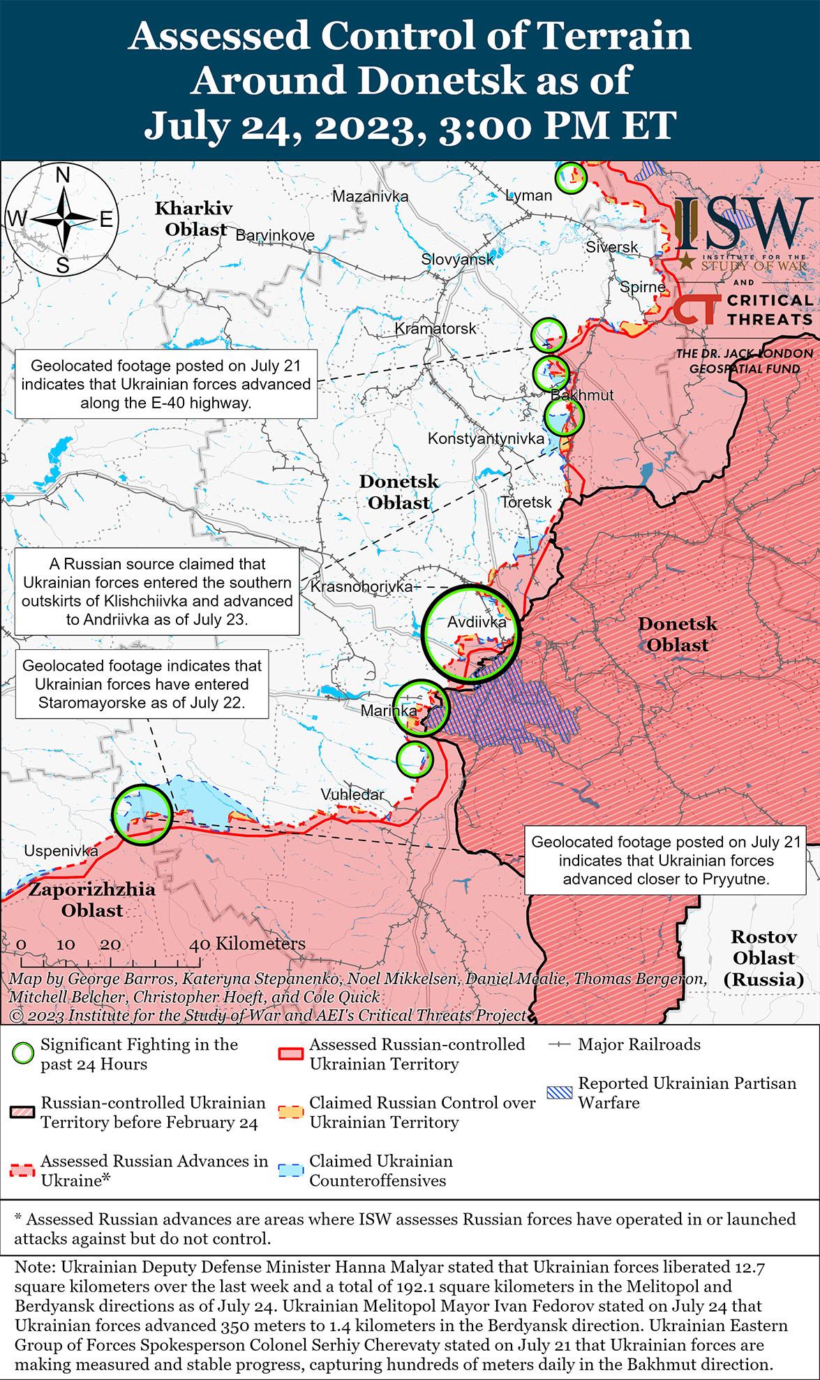 - 24 июля украинские силы продолжили контрнаступательные операции по меньшей мере на трех участках фронта и, как сообщается, продвинулись на некоторых участках.
