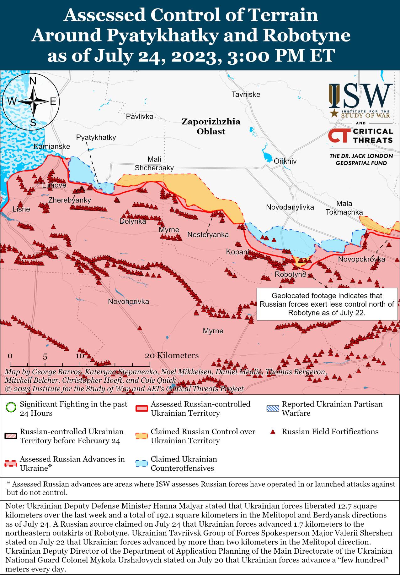 24 июля украинские силы продолжили наступательные действия на западе Запорожской области и, как сообщается, продвинулись в районе Орехова. Российский блогер заявил, что украинские войска продвинулись на 1,7 км в сторону северо-восточной окраины Роботино (15 км к югу от Орехова). Другие российские блогеры утверждали, что украинские силы перегруппировываются возле Роботино после попытки атаки 23 июля. На геолокационных кадрах, опубликованных 23 июля, видно, как подразделения 810-й бригады морской пехоты (Черноморский флот) и 291-го мотострелкового полка (42-я мотострелковая дивизия, 58-я общевойсковая армия, Южный военный округ) отражают украинские атаки к северо-востоку от Роботино. Маляр также сообщила, что украинские силы вели успешные наступательные действия к юго-востоку от Орехова на линиях Новоданиловка — Вербовое и Малая Токмачка — Вербовое и к югу от Орехова на линии Новоданиловка — Роботино. Российские источники утверждали, что ситуация остается неизменной вблизи Пятихаток (примерно 25 км к юго-западу от Орехова).