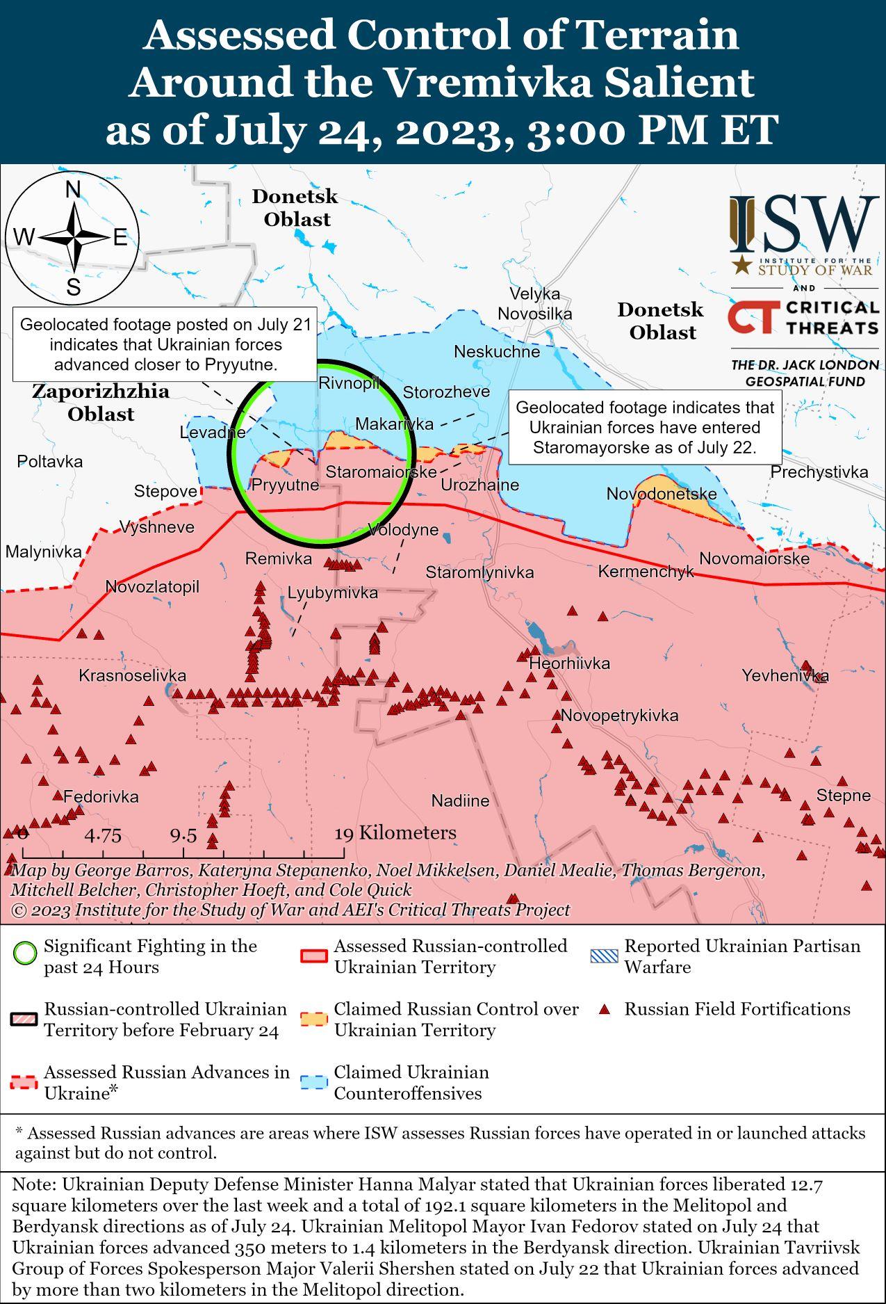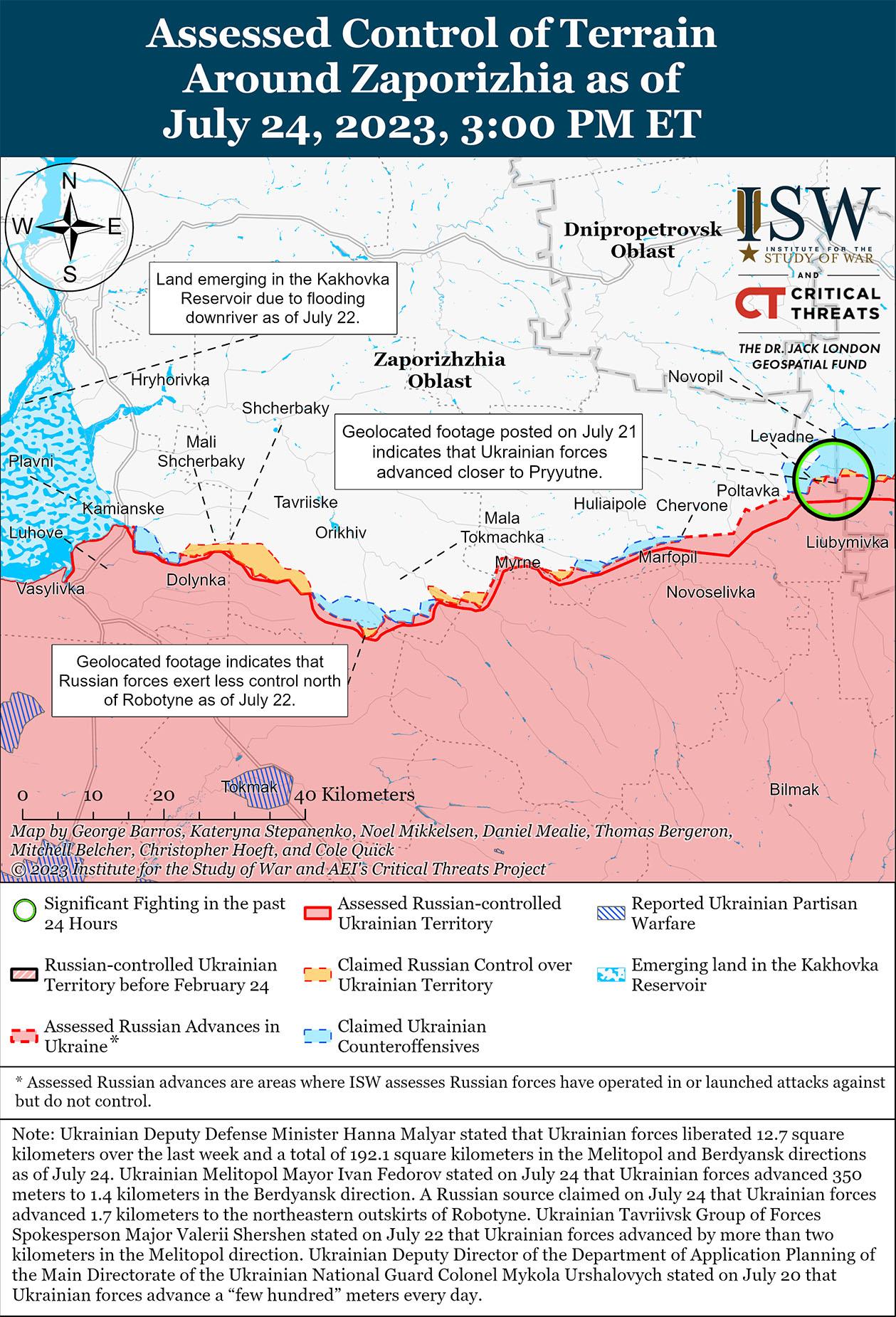 24 июля российские войска не проводили никаких заявленных или подтвержденных наземных атак на западе Запорожской области.