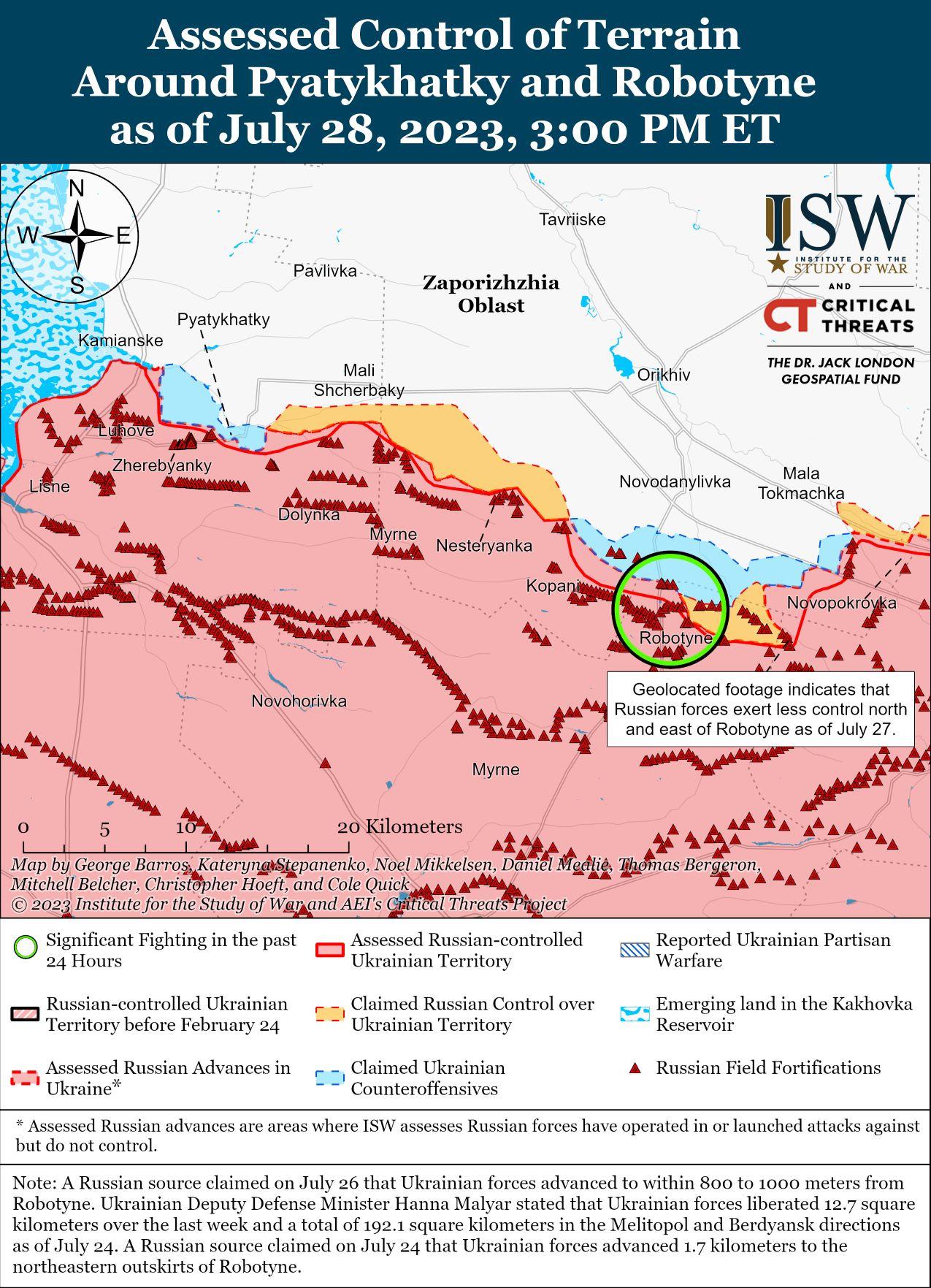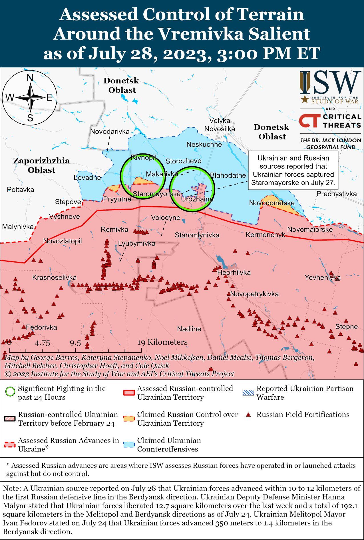 Украинские силы вели контрнаступательные операции как минимум на трех участках фронта и, как сообщается, продвинулись в районе Бахмута 28 июля. Украинские военные чиновники заявили, что украинские силы продолжают контрнаступательные операции на северном и южном флангах Бахмута, а заместитель министра обороны Украины Анна Маляр заявила 27 июля, что украинские силы продолжают продвигаться к югу от Бахмута. 28 июля российский блогер заявил, что украинские войска продвинулись в районе Курдюмовки и Андреевки. Российские военные блогеры утверждали, что украинские силы продолжали наземные атаки вдоль границы Донецкой и Запорожской областей в районе Старомайорского (9 км к югу от Великой Новоселки) и Урожайное (9 км к югу от Великой Новоселки), а некоторые военные блогеры признали, что украинские войска захватили Старомайорское 27 июля. Украинский источник утверждал, что украинские силы продвинулись в пределах 10-12 километров от основного российского оборонительного рубежа на Бердянском направлении. Российские блогеры утверждали, что российские войска отразили наземные атаки украинских войск вблизи Роботино (10 км к югу от Орехова), Вербового (17 км к юго-востоку от Орехова) и Пятихаток (25 км к юго-западу от Орехова) на западе Запорожской области. Командир российского батальона «Восток» Александр Ходаковский заявил, что украинские силы могут наносить удары по всей глубине обороны российских войск и что эти удары убивают российских командиров и ослабляют российское командование. В Генштабе Украины сообщили, что 247-й гвардейский десантно-штурмовой полк (7-я дивизия ВДВ) отказался идти в бой под Старомайорским из-за больших потерь россиян и побед Украины на поле боя.