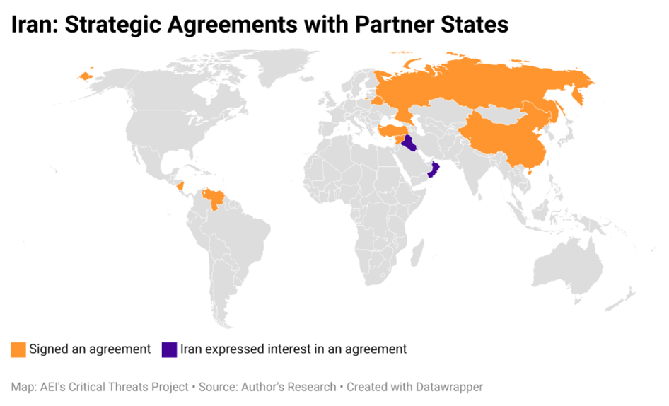 Тесное сотрудничество Ирана с Беларусью и Россией может быть связано отчасти с тем, что Иран подписал долгосрочные стратегические соглашения с этими странами. На приведенном ниже рисунке показано, с какими странами Иран подписал или заключает соглашения о сотрудничестве.