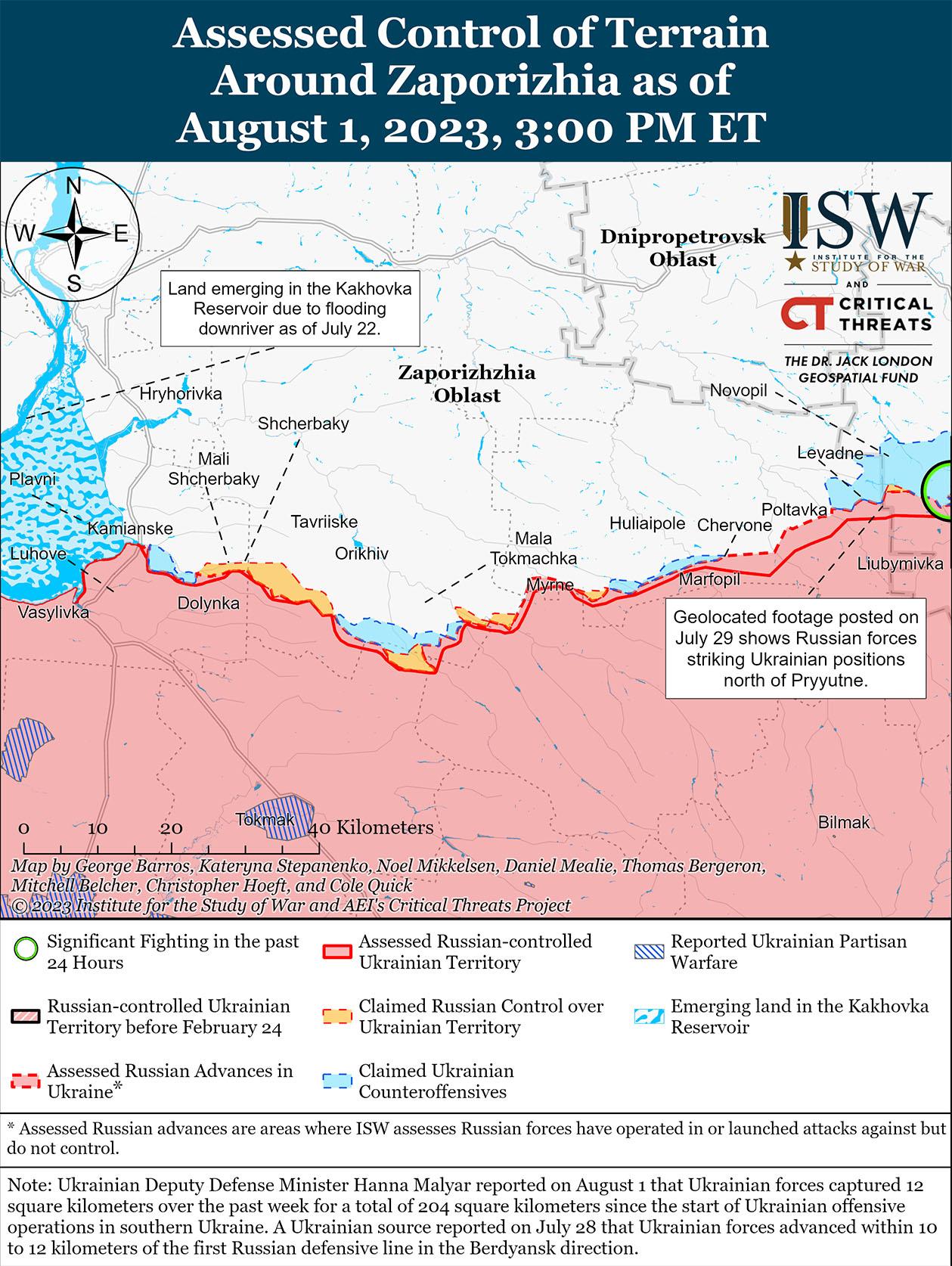 Украинские силы продолжали наступательные действия на западе Запорожской области и 1 августа не добились подтвержденных успехов. В украинском Генштабе сообщили, что украинские силы продолжают наступательные действия на Мелитопольском (запад Запорожской области) направлении. [68] Российские источники утверждали, что украинские силы безуспешно атаковали российские войска в районе Роботино (10 км южнее Орехова) и что подразделения 42-й мотострелковой дивизии (58-я общевойсковая армия, Южный военный округ) и 70-го гвардейского мотострелкового полка (42-я мотострелковая дивизия 58-й общевойсковой армии Южного военного округа) отразили атаку. [69] Российский источник утверждал, что украинские силы атакуют российские позиции в районе Роботино пешими мобильными пехотными волнами без поддержки бронетехники, в то время как другие российские источники утверждали, что украинские силы продолжали использовать небольшие штурмовые группы для ограниченных атак (и маловероятно, что украинские силы будут проводить «волновые» атаки, сравнимые с предыдущим использованием этого термина для описания российской тактики в Бахмуте). [70] Отсутствие единого мнения в российском информационном пространстве относительно масштабов предполагаемой украинской атаки в районе Роботино позволяет предположить, что украинские силы, скорее всего, продолжают проводить ограниченные атаки в этом районе. Российский блогер также заявил, что украинские резервы перемещаются из Херсонской области в Запорожскую. [71]
