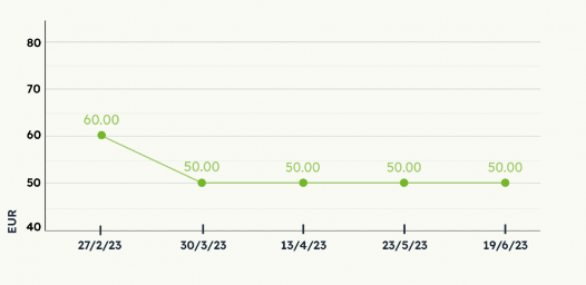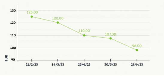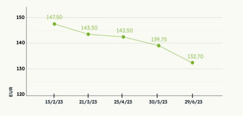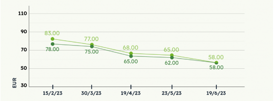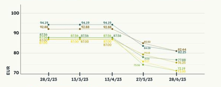 Динамика средних цен (евро/кбм) на балансы в первой половине 2023 года