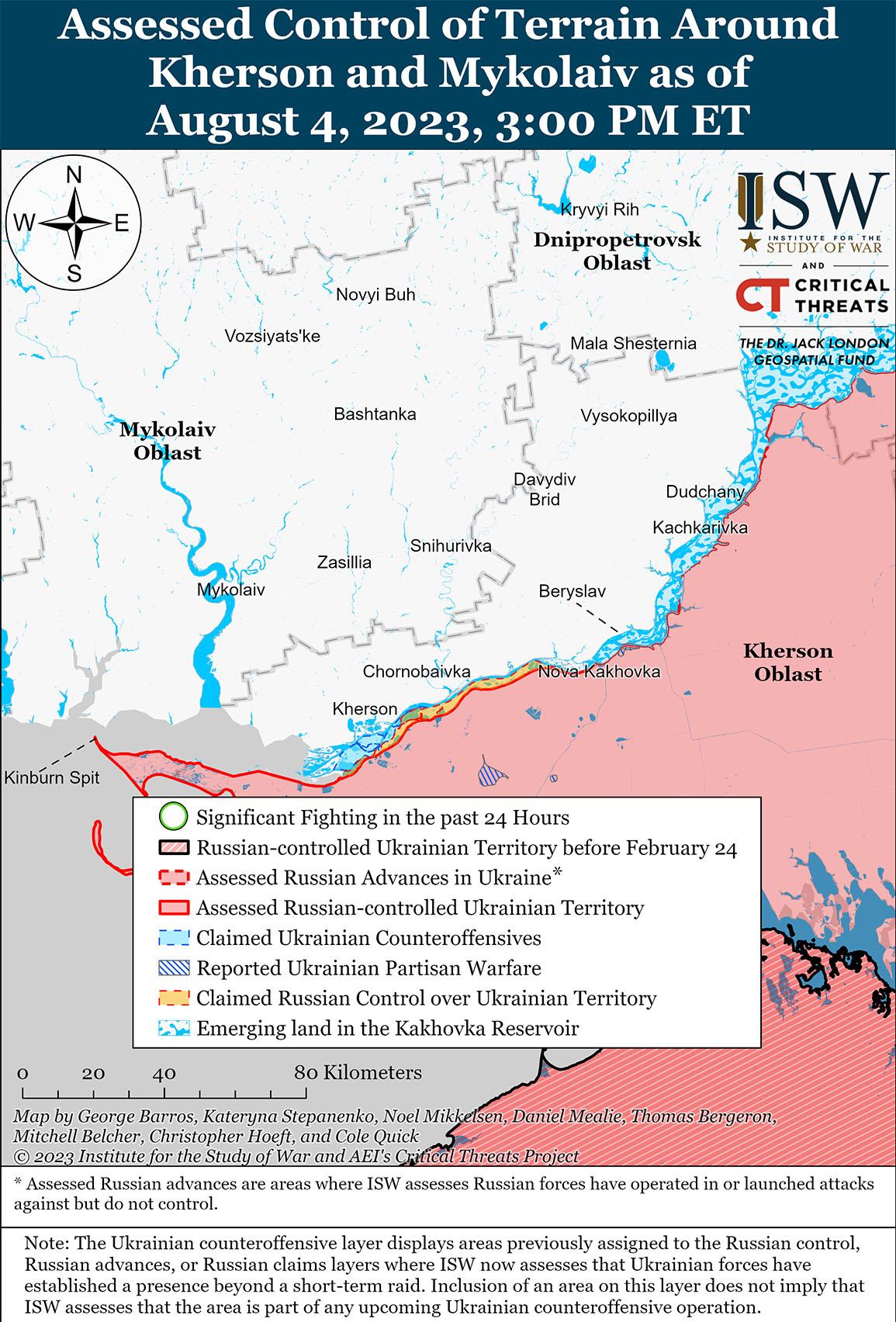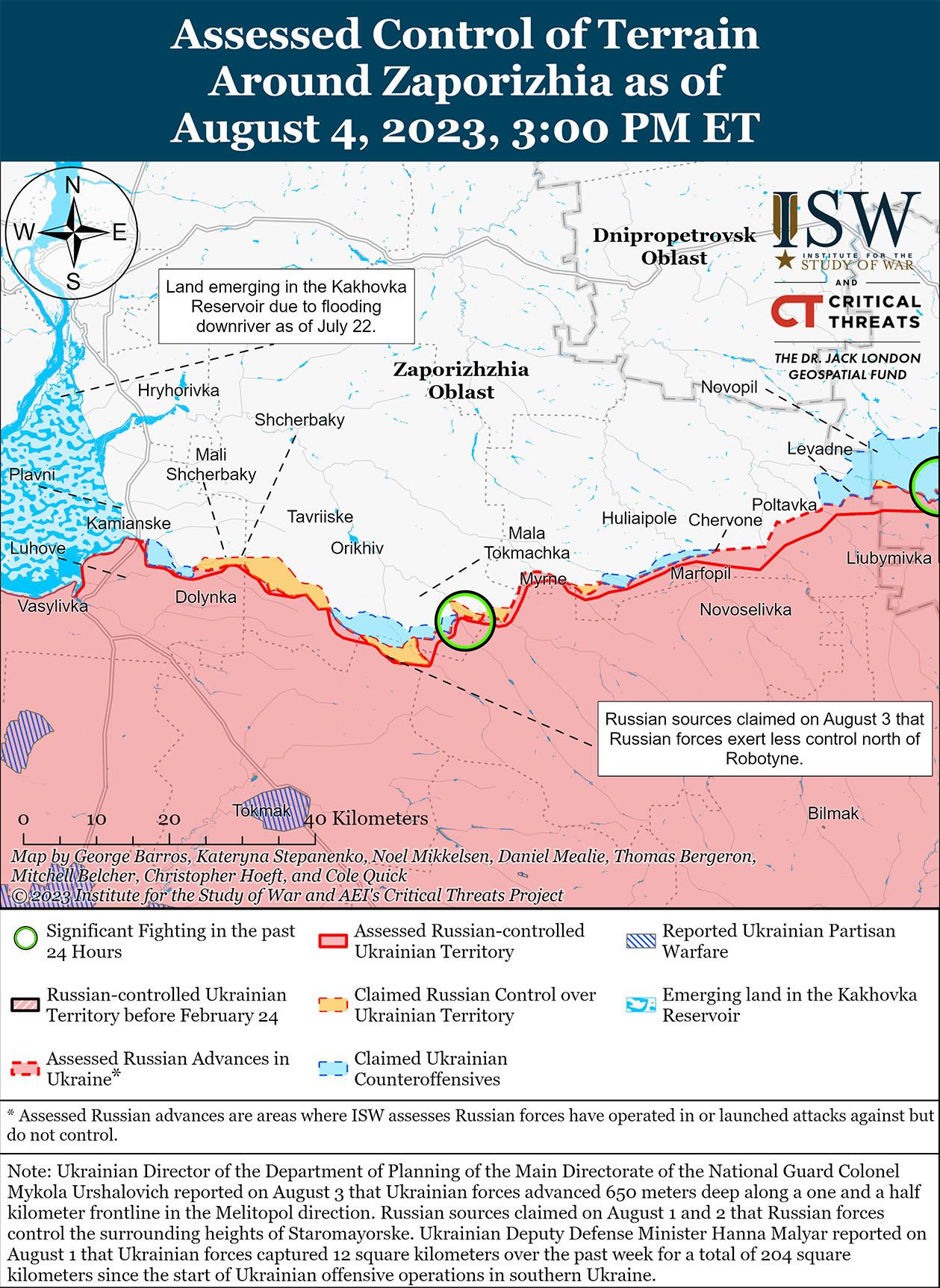 4 августа украинские войска продолжили контрнаступательные операции на западе Запорожской области, но не добились каких-либо подтвержденных успехов. В украинском Генштабе сообщили, что украинские силы продолжают наступательные действия на Мелитопольском (запад Запорожской области) направлении. [64] Минобороны России заявило, что российские войска отразили украинское наступление возле с. Роботино (12 км к югу от Орехова). [65] Российские блогеры описывали наступательную активность Украины вблизи Роботино как ограниченную и утверждали, что украинские силы вели штурмы без поддержки бронетехники. [66] Российские источники отметили, что темпы украинских контрнаступательных действий на Ореховском направлении продолжают снижаться третий день подряд. [67] Один из блогеров утверждал, что 3 августа украинские войска продвинулись к востоку от Роботино в направлении Вербовое (18 км к юго-востоку от Орехова), хотя ISW не видел визуального подтверждения этого утверждения. [68]