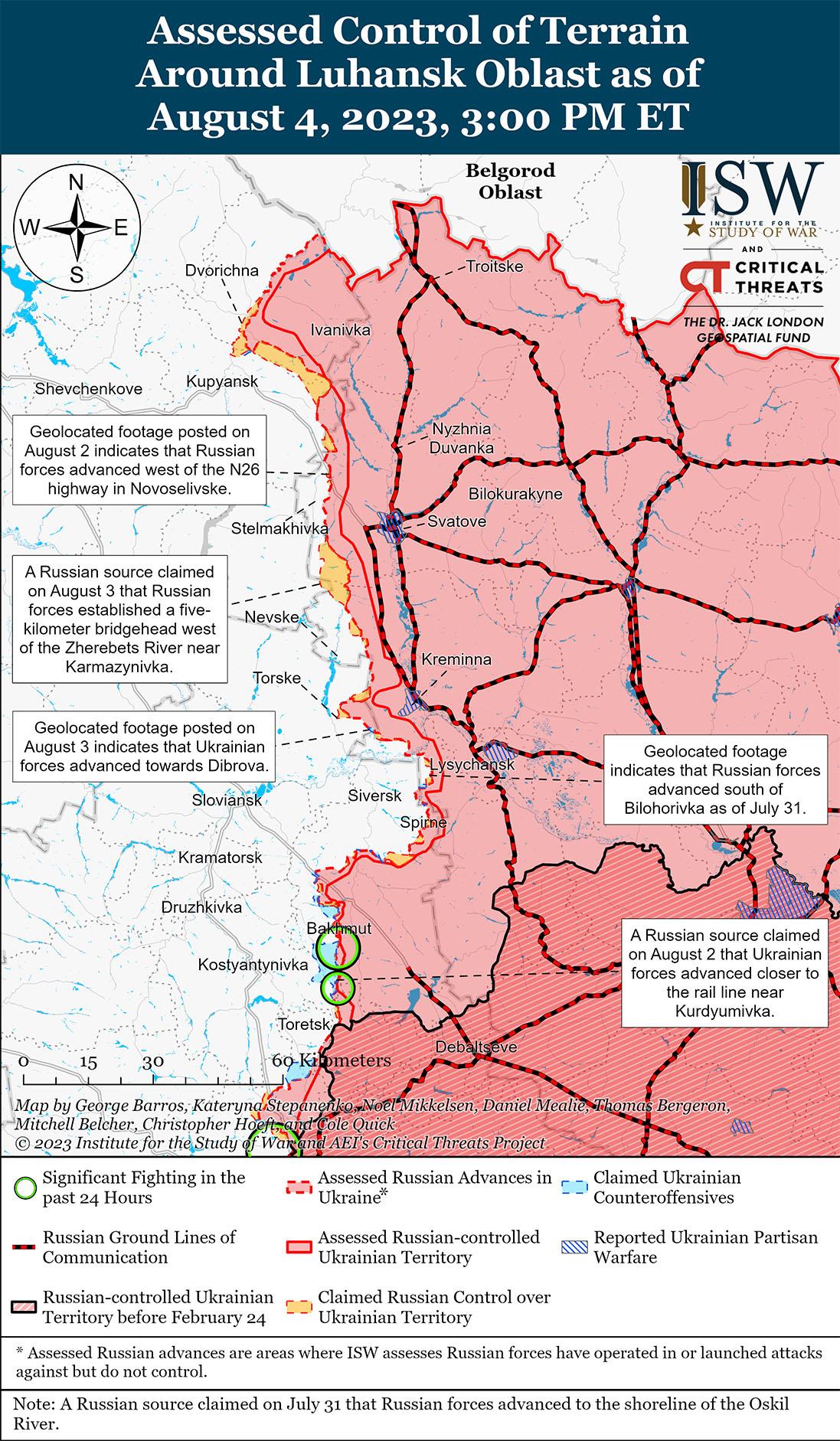 Украинские силы продолжали контрнаступательные операции в районе Бахмута, но по состоянию на 4 августа подтвержденных территориальных завоеваний не произошло. Заместитель министра обороны Украины Анна Маляр заявила, что украинские силы продолжают наступление на южный фланг Бахмута под плотным огнём российской артиллерии и минированием.[43] Российские военные блогеры утверждали, что ситуация на линии фронта в Бахмуте по состоянию на 4 августа не изменилась, бои продолжаются в районе Клещеевки (7 км к юго-западу от Бахмута) и Берховского водохранилища (6 км к северо-западу от Бахмута)[44]. Один российский военный блогер утверждал, что украинские силы продвигаются на 20 метров в день возле Клещеевки во время постоянных штурмов и что южная часть населенного пункта находится под контролем Украины[45]. Другой российский военный блогер утверждал, что небольшие украинские группы занимают позиции на окраине Клещеевки и не атакуют российские позиции в этом районе[46]. Военный блогер заявил, что российские силы отразили незначительные украинские атаки на линии фронта в районе Курдюмовки (12 км к юго-западу от Бахмута) и что российские силы сохраняют контроль над Андреевкой (10 км к юго-западу от Бахмута). Российский источник также заявил, что ситуация в Бахмуте «более опасна, чем кажется» для российских войск из-за украинской стратегии и наступления на северном и южном флангах Бахмута.[47]